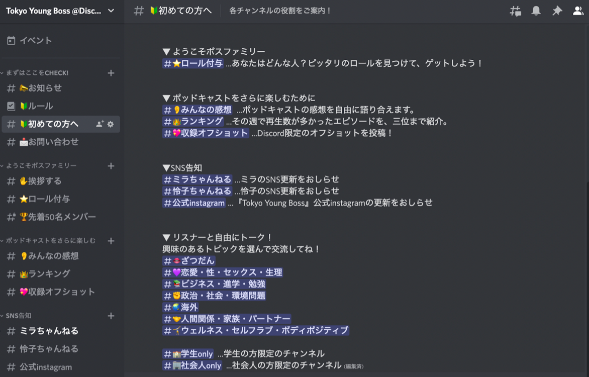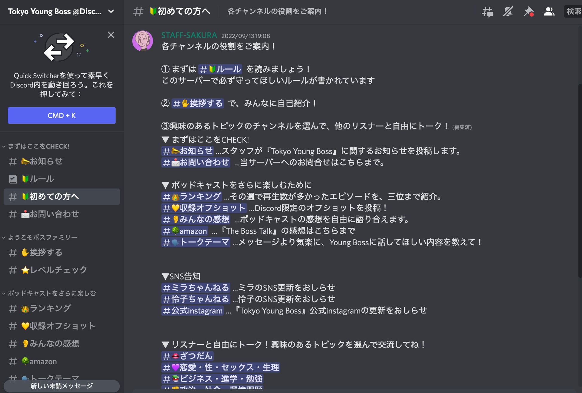 Discordサーバー『Tokyo Young Boss』では、ファン同士のリスナーコミュニティをより強く、暖かいものにするための仕組みを準備しております。