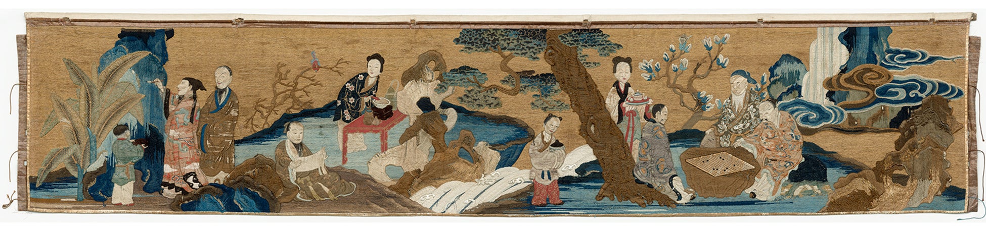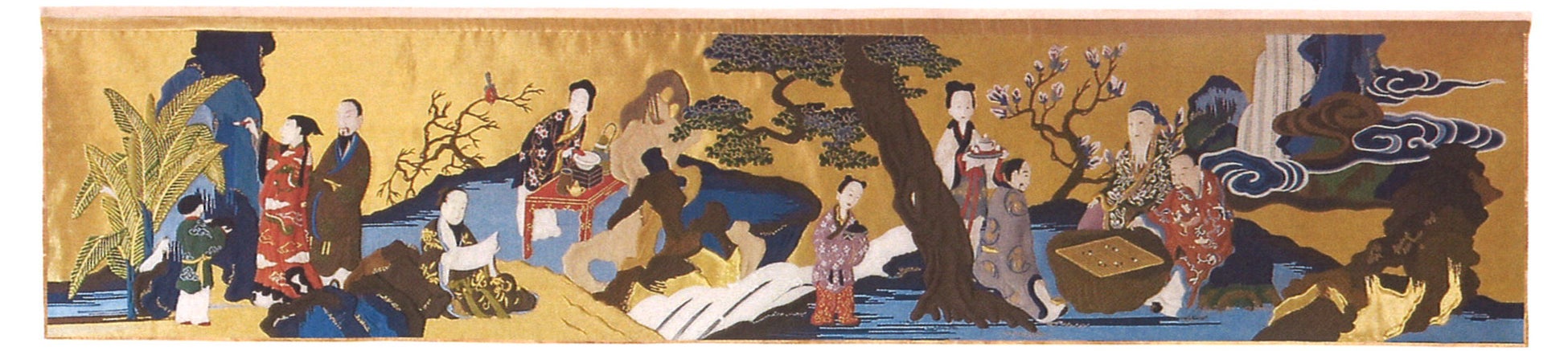 新調された下水引も原品同様に4枚で1組になっており、与謝蕪村が描いた中国の文人らが「琴」「囲碁」「書」などをたしなむ図柄を、時代考証や裏地の調査によって欠損した部分の色彩やデザインも明らかにし、職人の手作業による総刺繍にて再現されています。