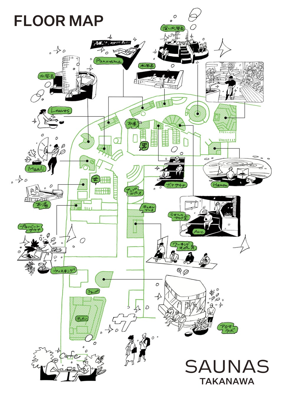 サウナ室内では多彩なリトリートプログラムを展開し、浴室にとどまらない体験を提供。さらに、レストラン、ワークスペース、ナップスペース、アロマラボを併設し、1日を通して過ごせる滞在環境を整えました。