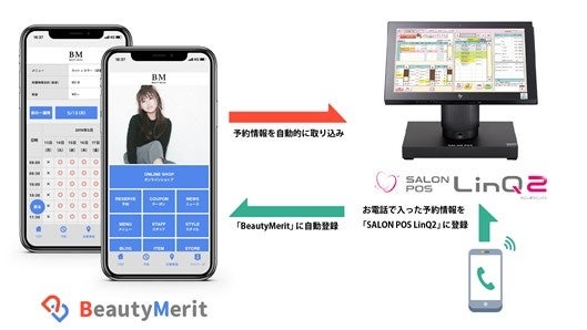 理美容サロン向けのクラウド型 POSシステム(顧客管理システム)である「SALON POS LinQ2」と「ビューティーメリット」をシステム連携することにより、ビューティーメリットから予約が入った情報を「SALON POS LinQ2」に自動的に取り込めるようになります。また、お電話で入った予約情報を「SALON POS LinQ2」に登録すると、ビューティーメリットにも予約情報が自動的に取り込めるようになり、予約情報を一元で管理することが出来るようになります。理美容サロンにとって、管理が最大限に軽減されることと同時に、予約情報の入力ミス等がなくなるメリットがあります。
