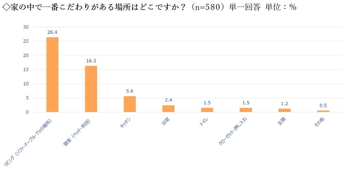 Emma Sleep Japan合同会社が実施した「新生活における睡眠と睡眠環境に関する意識調査」では、家の中で一番こだわりがある場所は「リビング」の回答が最も多い結果となりました。一方で、新生活の部屋づくりで一番こだわりたいものは「ベッド」と答えた方が最も多く、新生活に睡眠を重視したい人が多くいることがうかがえる結果となりました。