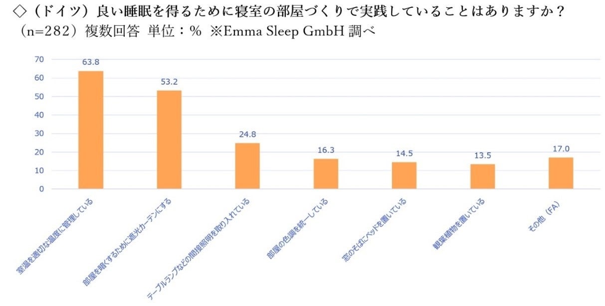 調査結果にもあったように、ドイツでは起きてからすぐにカーテンを開ける人が多く、活動の生産性向上につながっているのかと思います。最近はドイツでも遮光カーテンを使う方は多いですが、寝つきをよくするための工夫として、室温環境の管理が大事だと考えています。