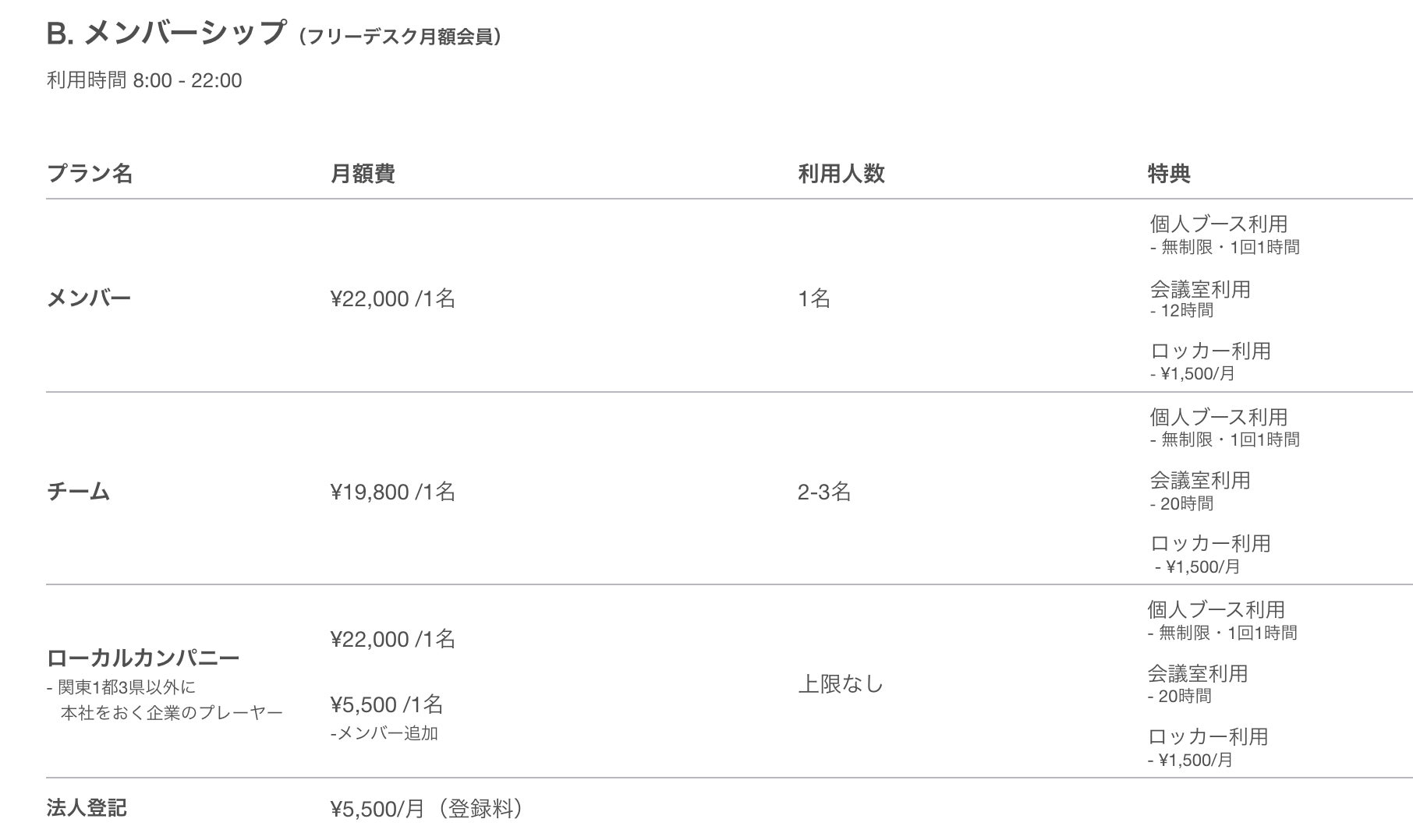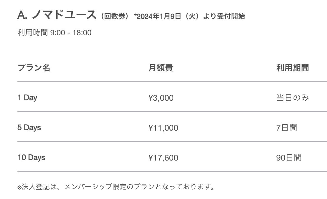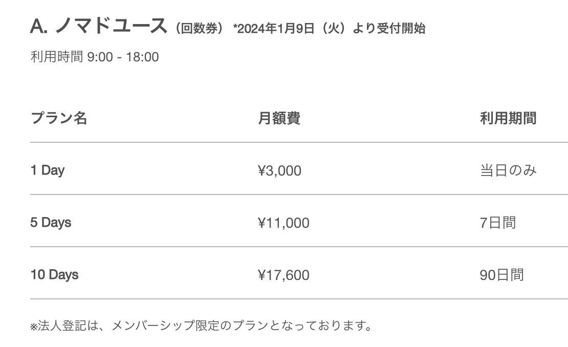 コワーキングスペースの利用については、フリーデスクの月額会員プランに加えて、主にデジタルノマドに向けた回数券型の「ノマドユースプラン」や、日本国内、関東1都3県以外に本社をおく企業のプレーヤーたちを対象にメンバーシップに割引を適用する「ローカルカンパニープラン」があります。