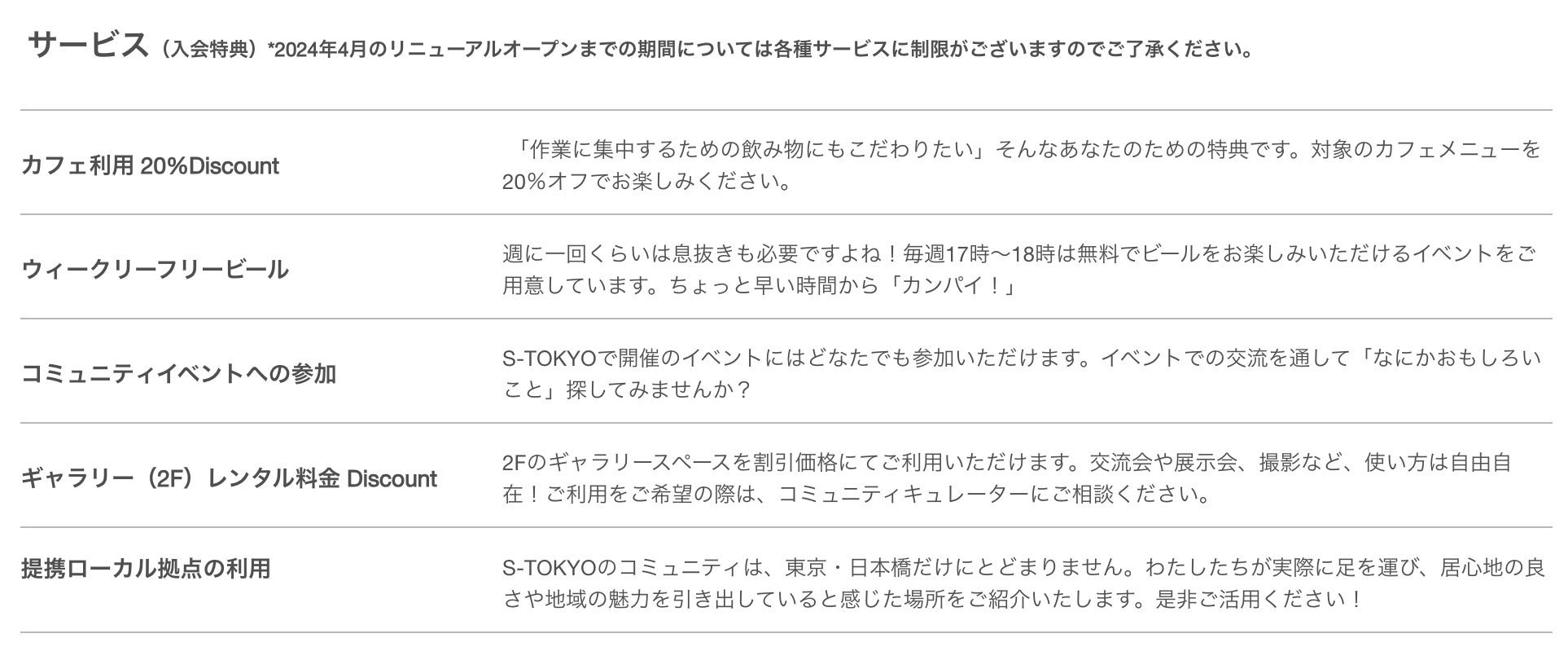 S-TOKYOにご入会いただきますと、入会特典としてウィークリーフリービールのサービスやカフェのディスカウントサービスなどをお受けいただけます。