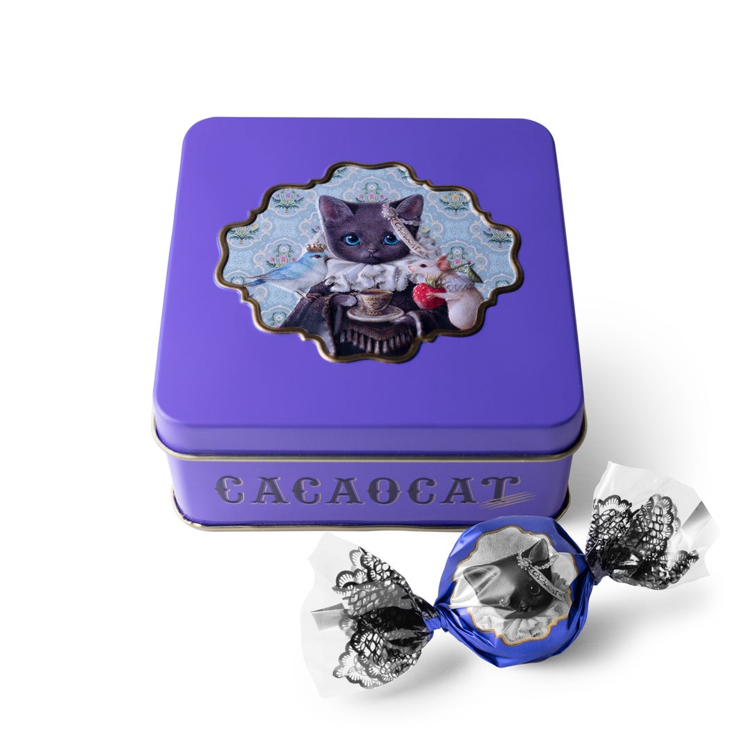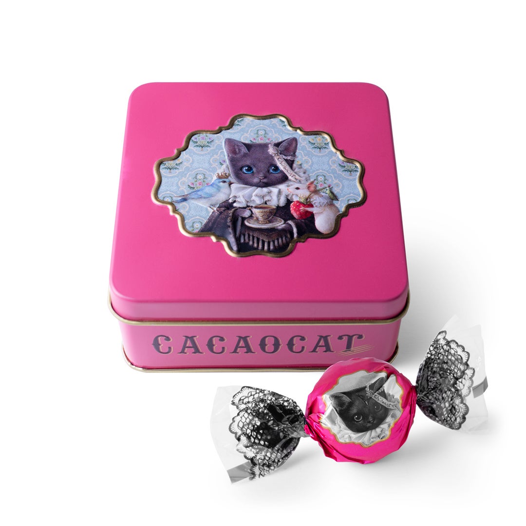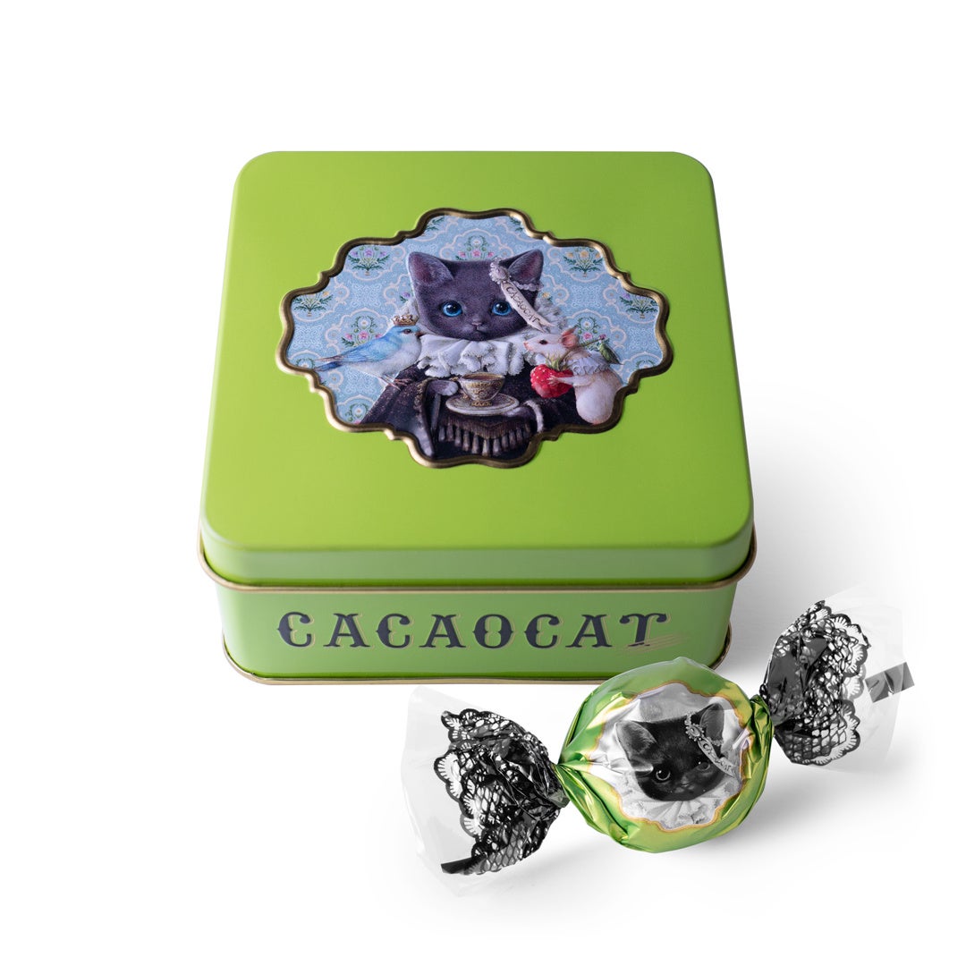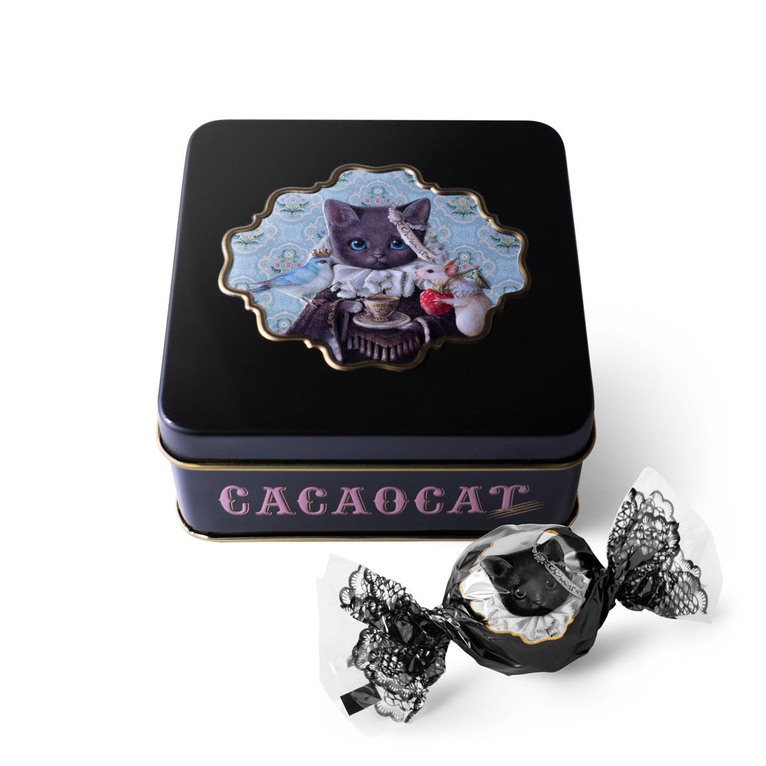 「食べ終わったら、この可愛い缶を何に使おう」そんなことを想像するのも、スイーツ缶を選ぶときの楽しみの1つですね。そして、チョコレートトリュフを包むフィルムにも注目!パッケージと同じ、左耳にキラキラと輝くCACAOCATと描かれたジュエリーを付けた黒猫と美しい黒いレースがデザインされたフィルムは捨てるのがもったいなくなる可愛さです。