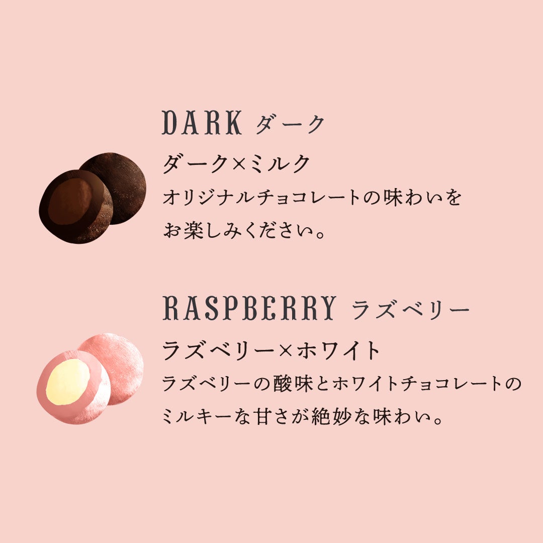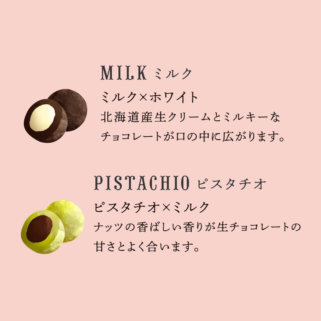 オリジナルチョコレートの味わいをお楽しみいただけるダーク。北海道産生クリームとミルキーなチョコレートが口の中に広がるミルク。ナッツの香ばしい香りが生チョコレートの甘さとよく合うピスタチオ。ラズベリーの酸味とホワイトチョコレートのミルキーな甘さが絶妙な味わいのラズベリー。紅茶の香りが口の中に広がるミルクティー。北海道産の生クリームをたっぷり使用したこだわりの逸品である塩キャラメル。全6種のフレーバーはチョコレートが2層になっており、口に入れた瞬間のチョコレートの味わい、そして口の中でチョコレートがとろけ、中のフィディングが混ざり合った瞬間のハーモニーがあなたを夢の世界へと誘います。