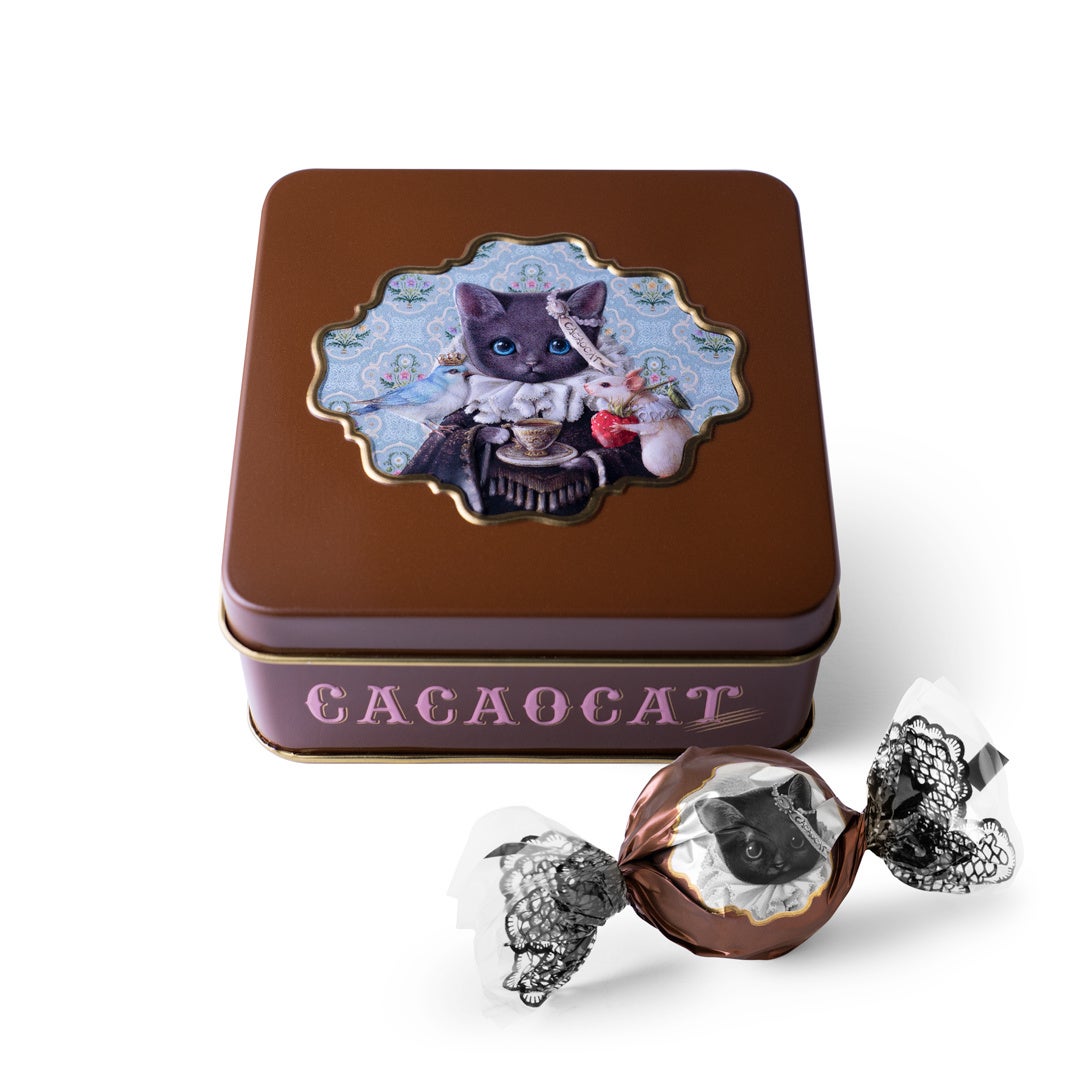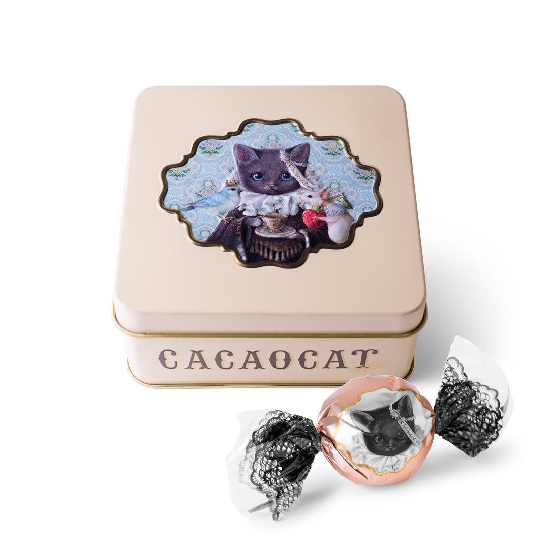 パッケージには艶々とした黒い毛に、透き通るような青い目をした猫。左耳にキラキラと輝くCACAOCATと描かれたジュエリーにはどんな意味があるのだろう。ティアラを付けた小鳥や可愛い白ねずみと共に愉しむティータイムにはきっと、とびきりスペシャルなスイーツが一緒に違いない!それはそれは美味しいスイーツなんだろうな。