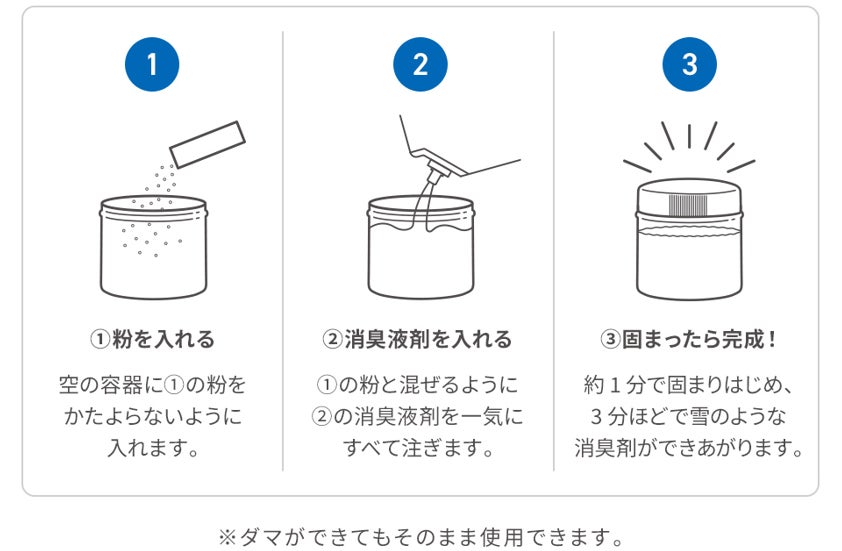 専用液剤を加えると、まるで雪がふんわりと積もるように膨らみ、見た目にもきれいな消臭剤が完成します。