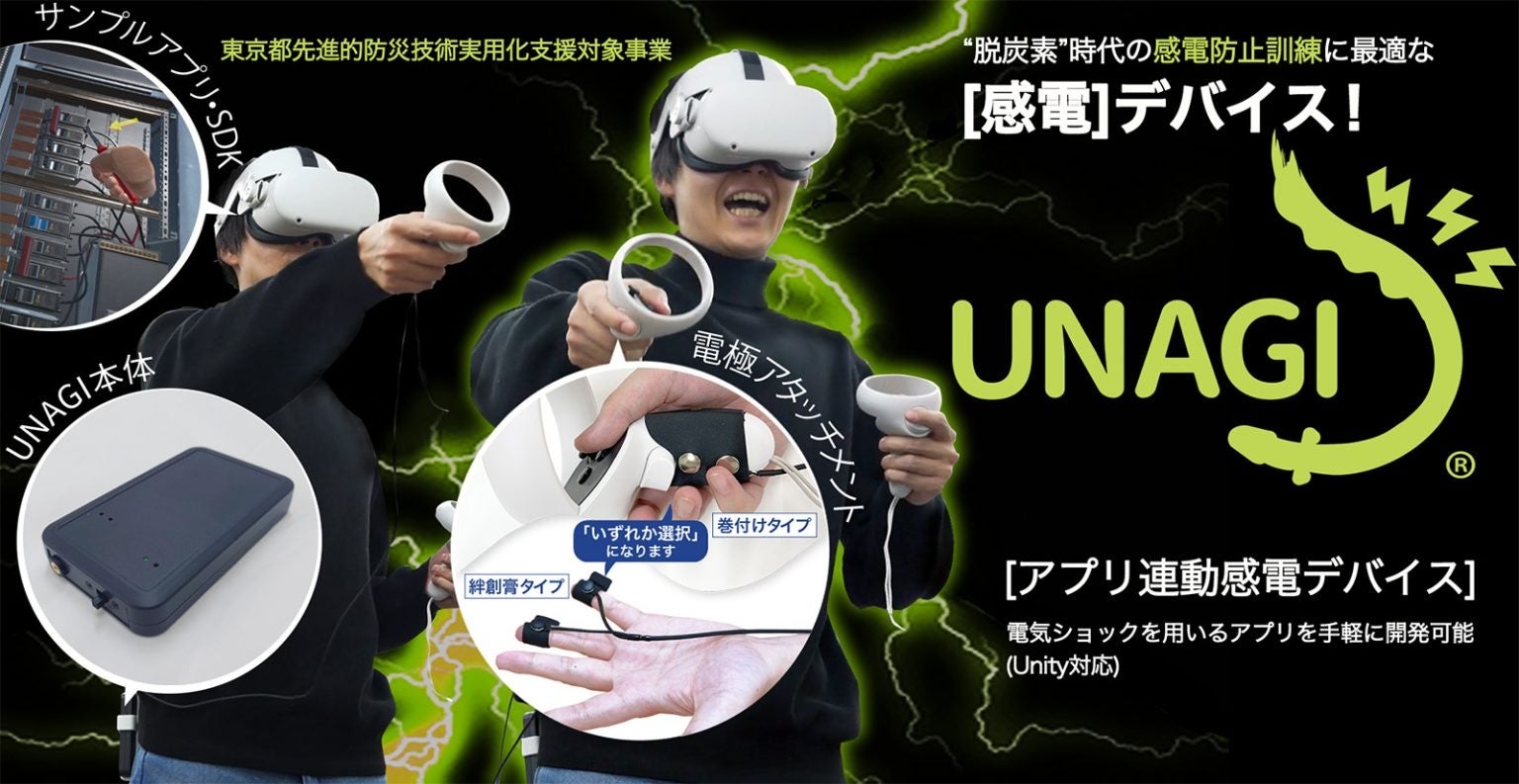 「UNAGI」は、体験型の感電防止訓練に活用できる、各種アプリケーションと連動することに特化したプログラム制御可能な感電体験デバイスです。