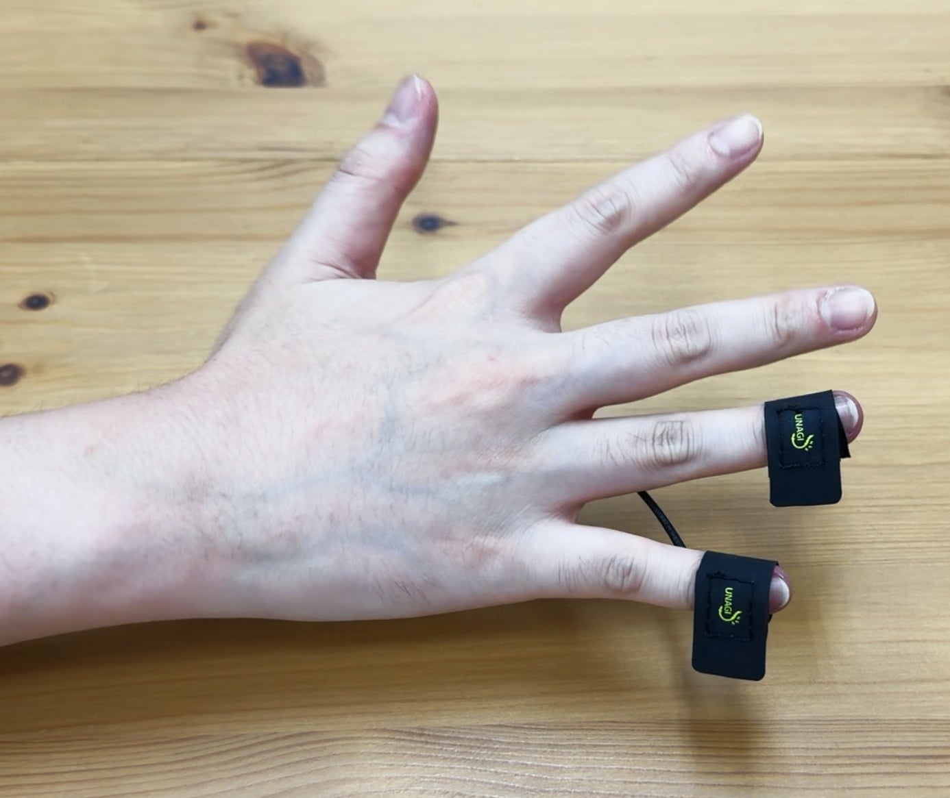 2.「UNAGI」の電極アタッチメントを指に巻くだけで装着完了