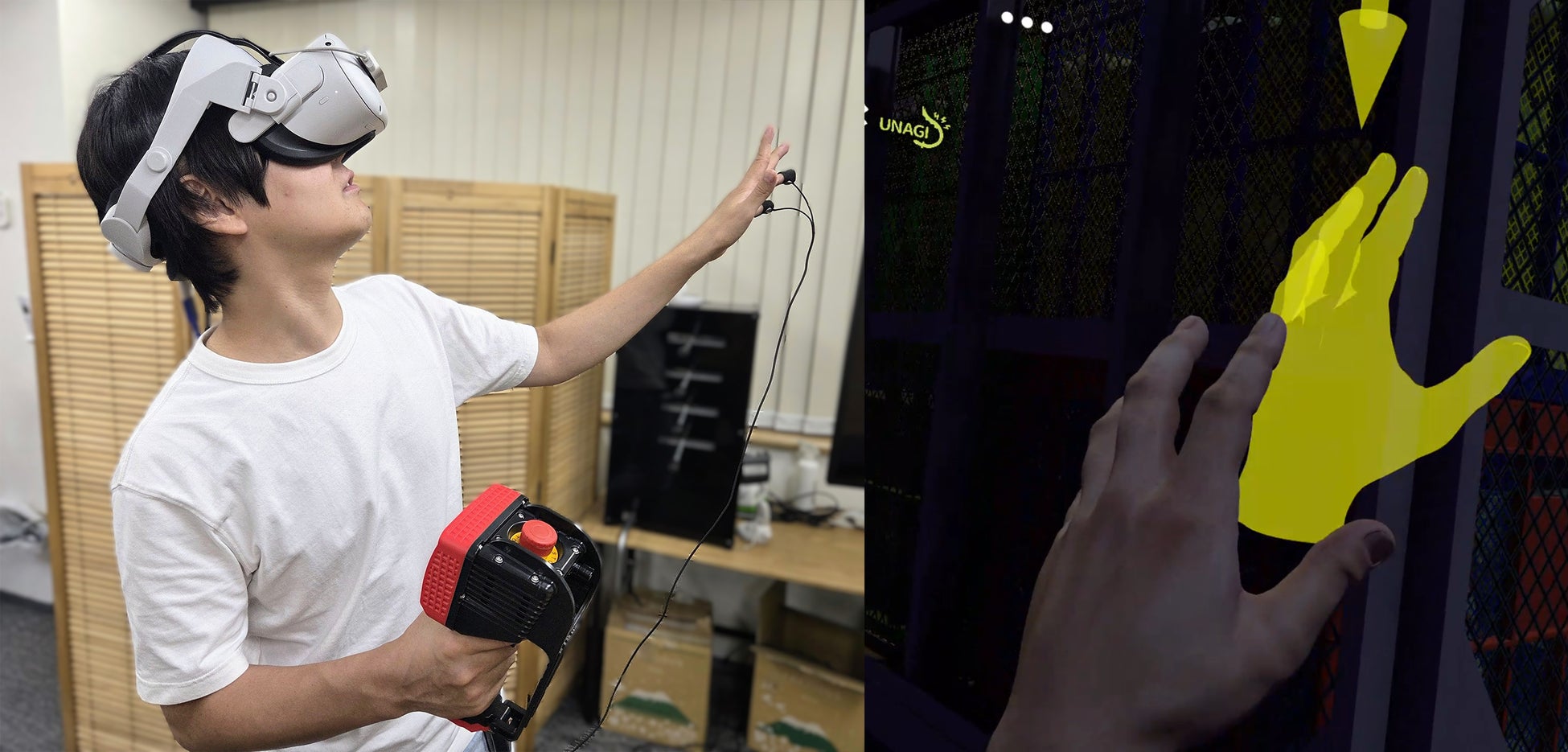 本連携機能は、VR空間内で体験者が感電災害に被災する瞬間に「UNAGI」が作動し、体験者の指に装着した電極から電気が流れます。身体に実際に電気が走る衝撃が伝わることで、感電の危険性を直感的かつ強烈に記憶に刻み込み、安全意識の飛躍的な向上を促します。