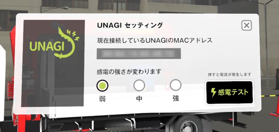 電流の強さはUNAGIアイコンを触って表示されるセッティングパネルで強・中・弱の三段階から選択できます。この画面から感電のテストも行えます。
