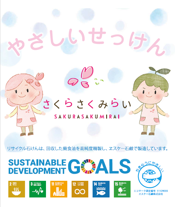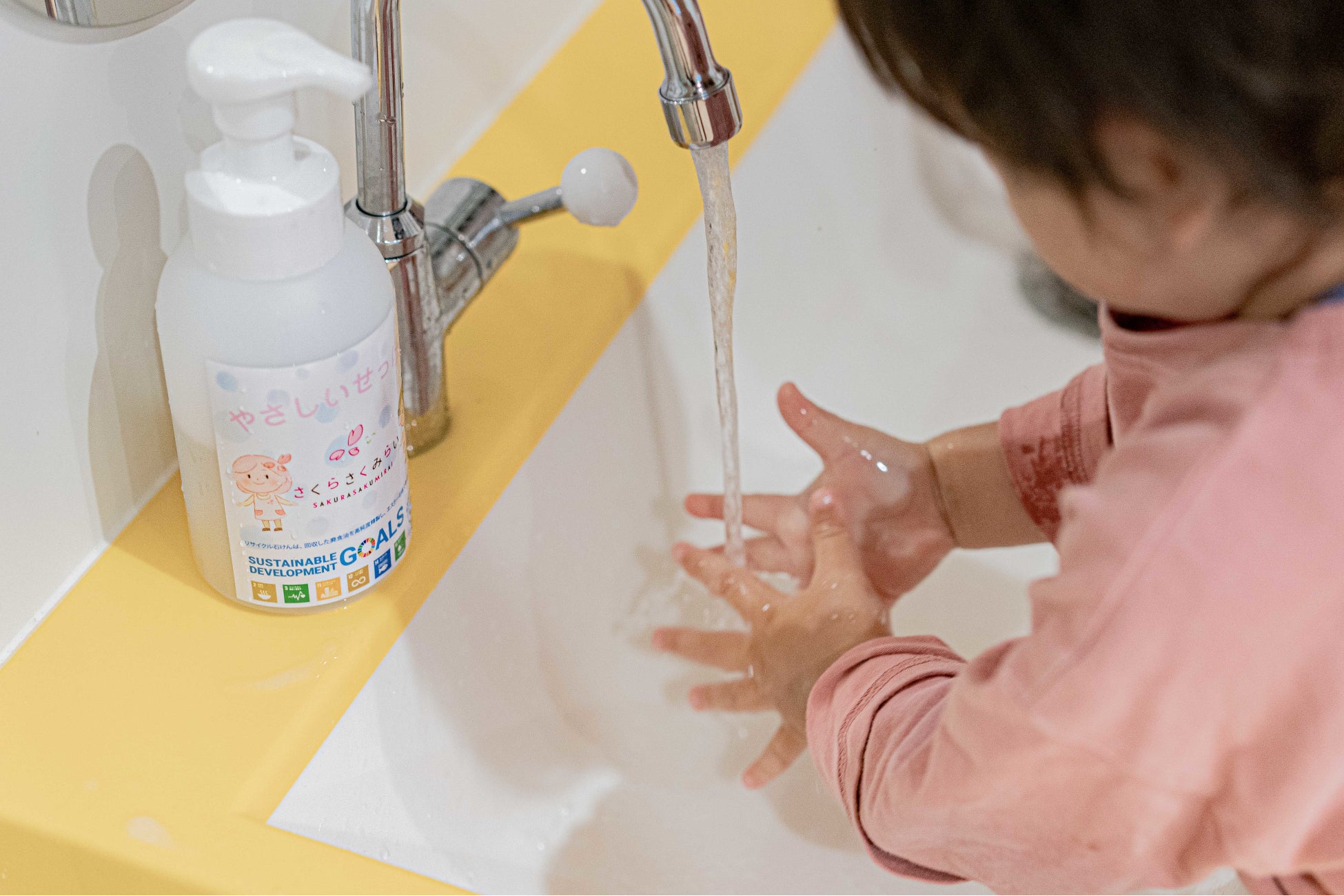 「⼦ども・保護者・職員」三者の笑顔に満ちた子育て環境の創出を⽬的に、東京を中心に保育所「さくらさくみらい」の運営を⾏う株式会社さくらさくみらい(本社:東京都千代田区、代表取締役社長:西尾 義隆、以下「当社」)は、2022年4月より順次、園児・職員へのSDGsの理解促進の取り組みとして、廃食油リサイクルにより生まれた「ヱスケー石鹸」のさくらさくみらい各園への導入を開始いたしました。また6月より、SDGsのロゴをあしらったオリジナルデザインのボトルの導入も開始し、更なるSDGsの啓発に努めています。