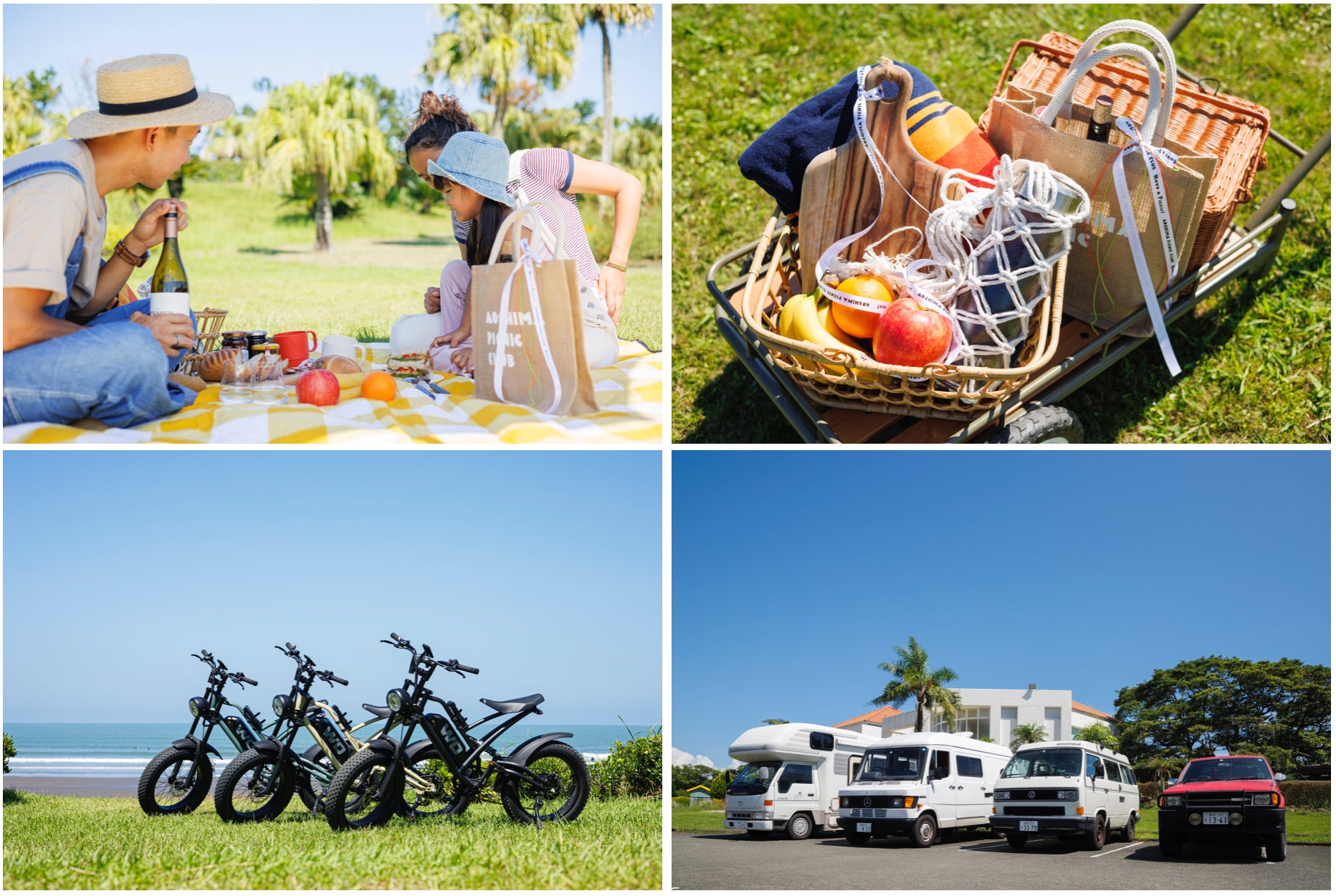 また、E-BIKEやキャンピングカーレンタルのサービスもご利用いただけます。E-BIKEでプチトリップしたり、キャンピングカーで遠出したり。AOSHIMA PICNIC CLUBを旅の拠点に、あなただけの旅が始まります。
