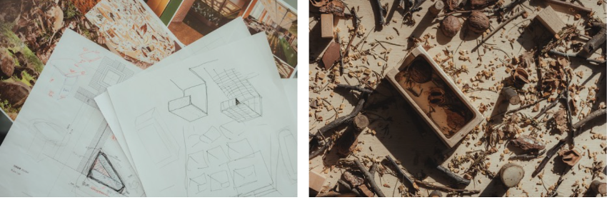 マテリアルには、狩野氏が創り出すマテリアル、ForestBank™️に「BAUMオークの森」から集めた小径木や枝葉、樹皮、実、プロダクトの木製パーツの端材などを混ぜ合わせたBAUMオリジナルのものを採用しています。