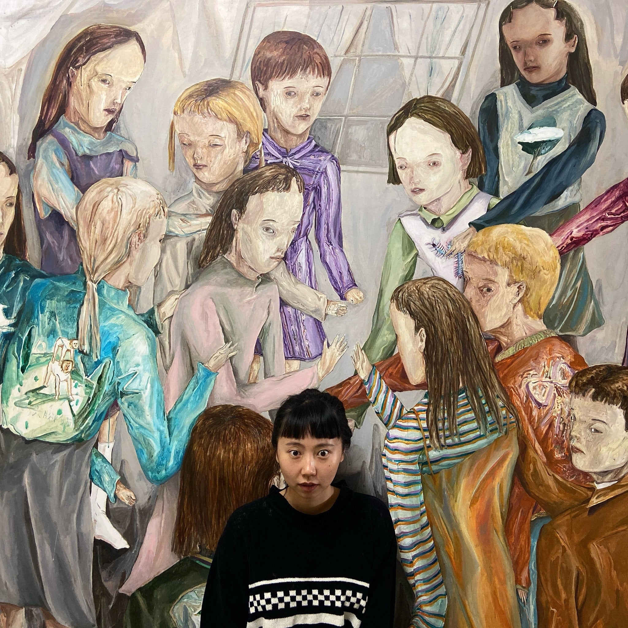 1991年台湾の台中生まれ。王冠蓁の作品に描かれている孤独や寂しさは、まるで宇宙に浮いているような感覚を与えられる。その人物の質感、筆致には小さな温もりが芽生えるが、即時にその周りの果てしない暗闇に包まれている。一見無関心に見える登場人物の表情は、喪失感や絶望を語り、どこか優しさに満ちたため息となっているように聞こえてくる。理性と情熱は紙一重であり、それが作品の魅力なのかもしれない。