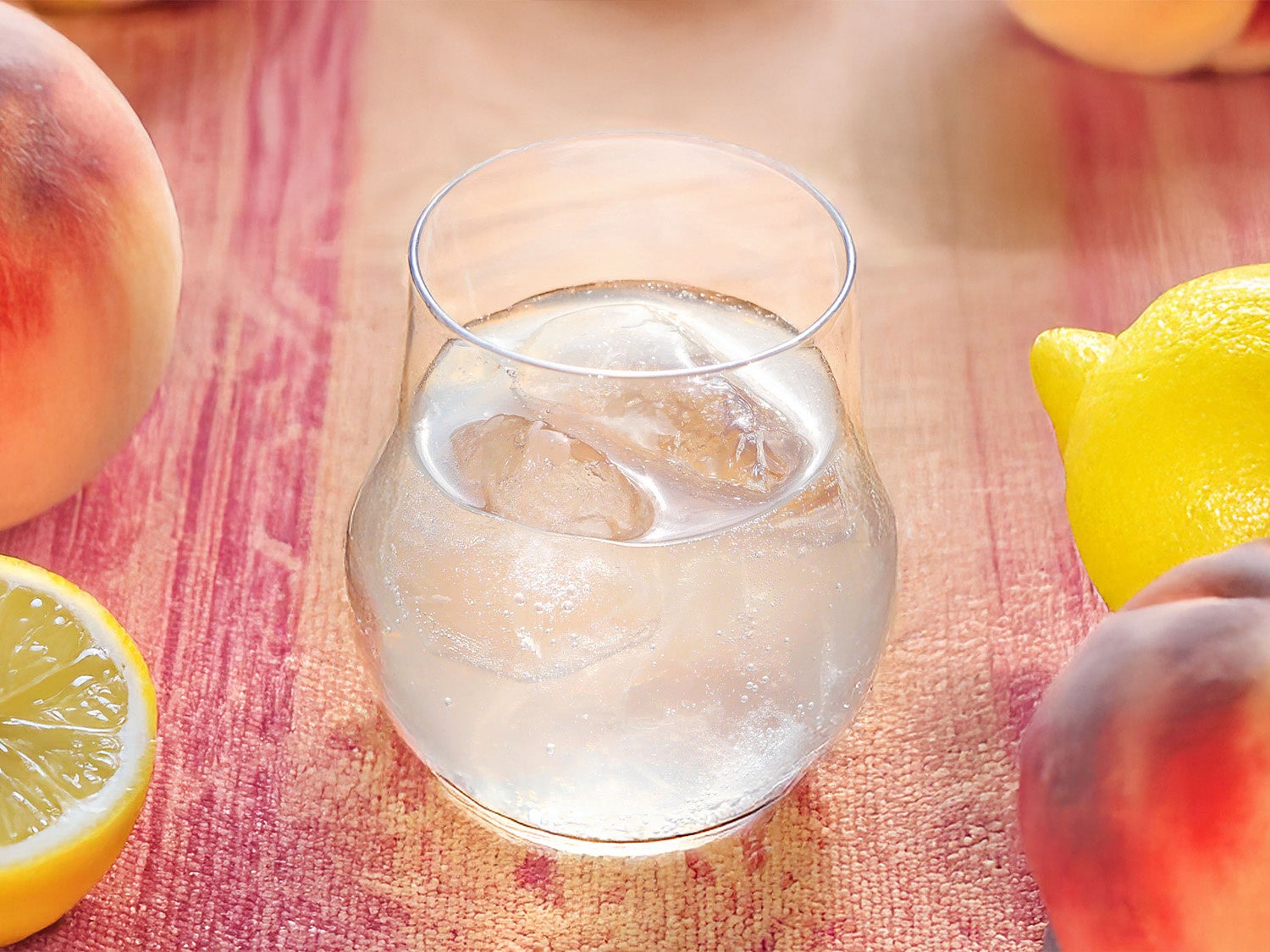 華やかな桃の香り、フルーティーな白桃の甘みとすっきりとしたレモンの後口がバランス良く調和した爽やかな味わいが特長です。飲む前によく冷やしてからお召し上がりください。