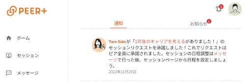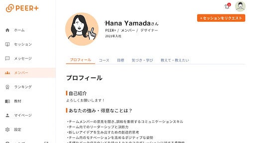 「PEER+」のホーム画面より、ピアコーチングを希望するメンバーを選択し、「セッションをリクエスト」をクリックすることで、直接コーチングセッションのリクエストが出来ます。横のつながりを新たにつくることはもちろん、ロールモデルになりそうなメンターなどを探して相談することもできます。