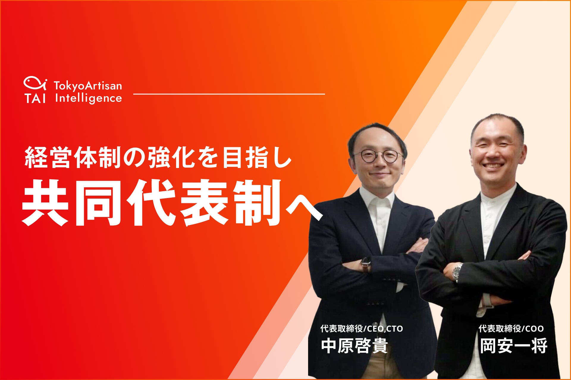 Tokyo Artisan Intelligence株式会社(本社:神奈川県横浜市、代表取締役:中原啓貴(CEO,CTO)、岡安一将(COO)、以下:TAI)は岡安一将が代表取締役・最高執行責任者(COO: Chief Operating Officer)に就任したことをお知らせいたします 。また、代表取締役の中原啓貴が技術領域を管轄する最高技術責任者(CTO: Chief Technology Officer)を兼務いたします。これらの変更により、共同代表制へと移行いたしました。