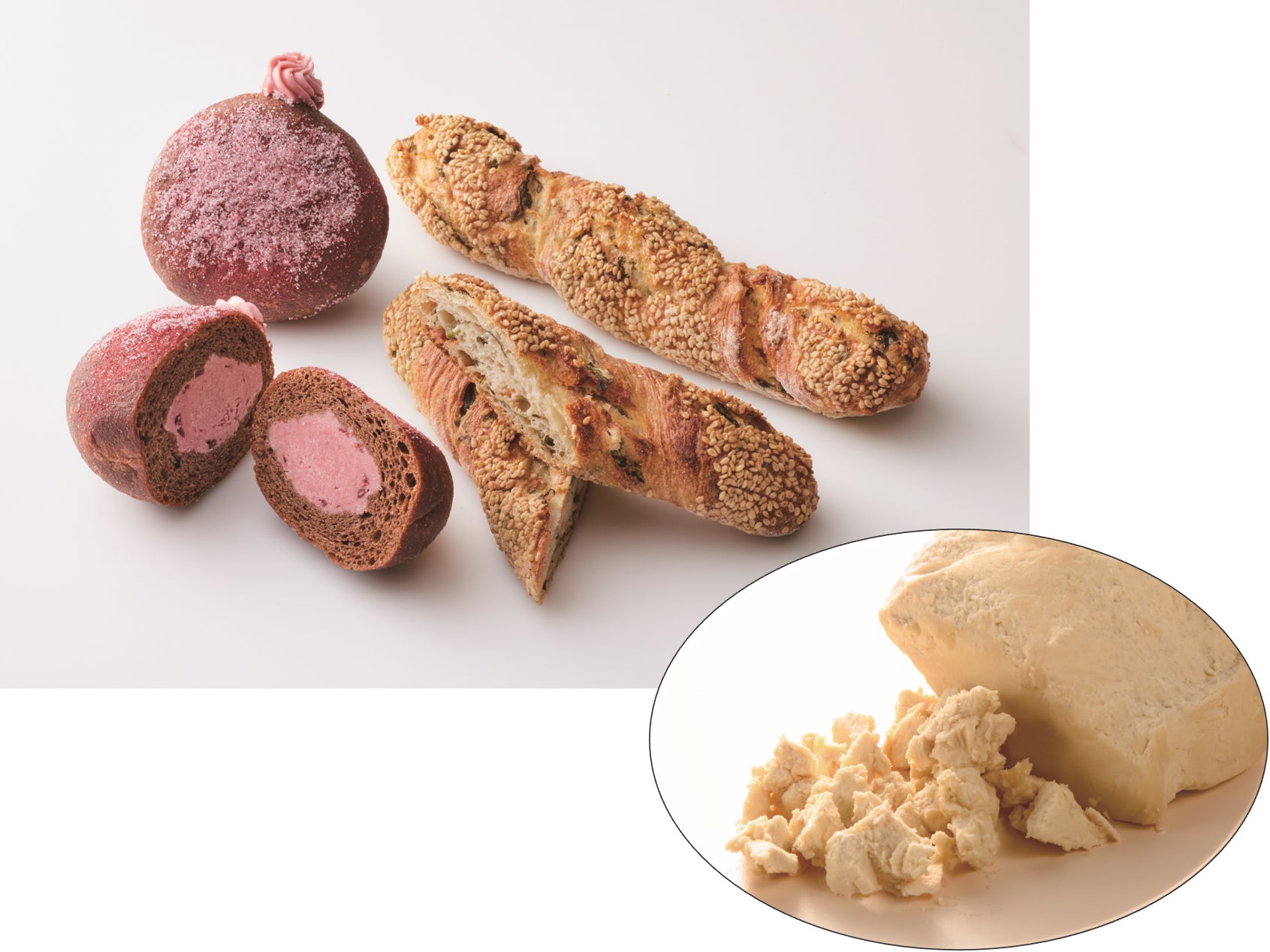 機能素材を高濃度に配合した機能性練込製品。少量添加で生地の吸水性を高める一方、生地のベタつきを抑制できるため、人気の多加水パンを機械化された製造ラインでもつくれます。もちもちとしたおいしい食感が持続し、消費期限延長にも貢献する製品です。