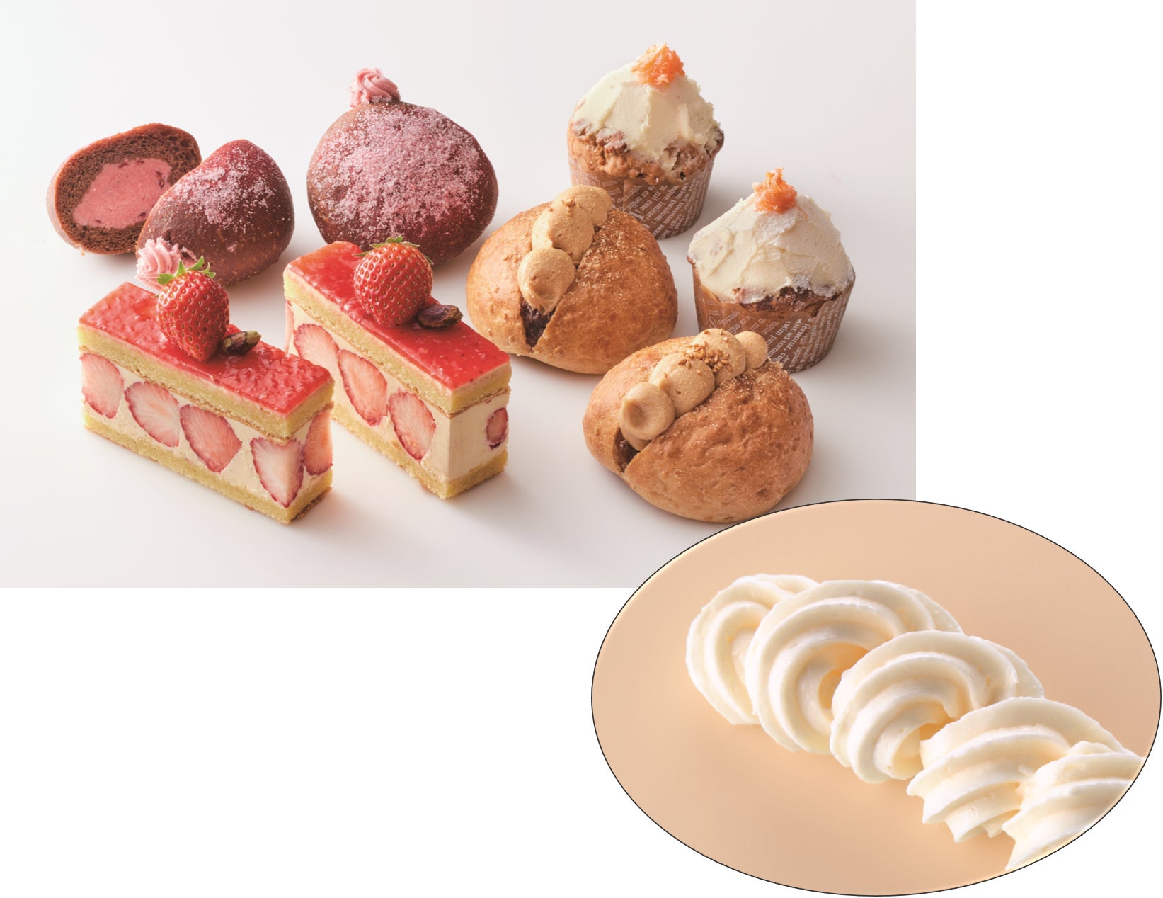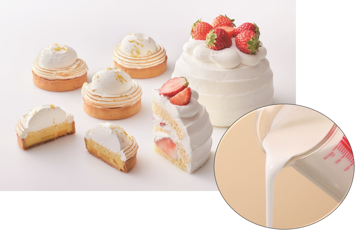 多量の液体原料を混合できる高濃度のホイップクリーム。牛乳、果汁等の地産原料を混合することで差別化された商品づくりに貢献する製品です。また、従来のクリーム製品に比べて低脂質なクリームがつくれるため、ギルトフリースイーツの製造も可能です。