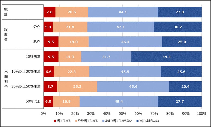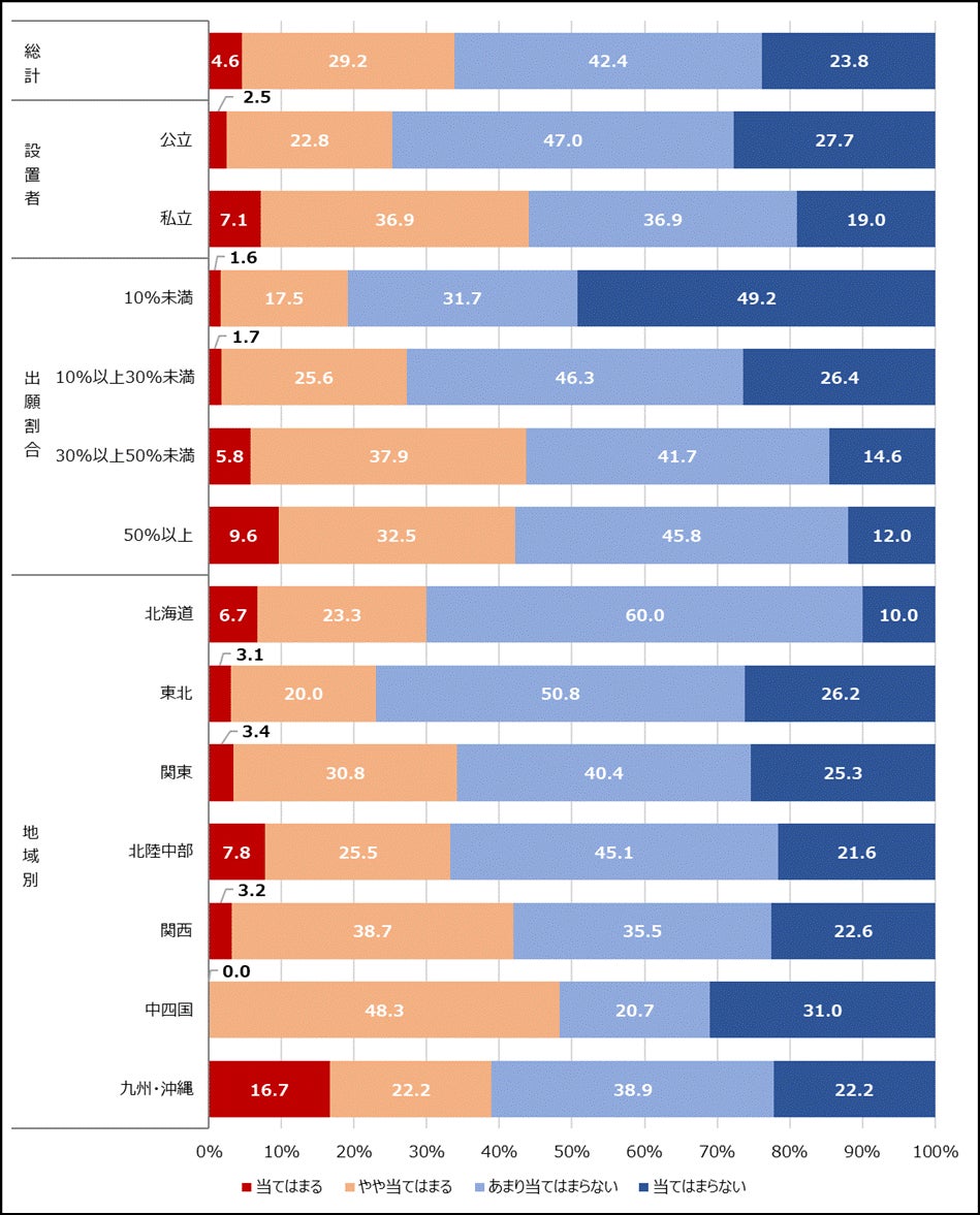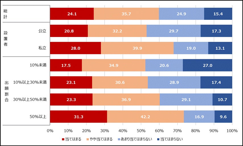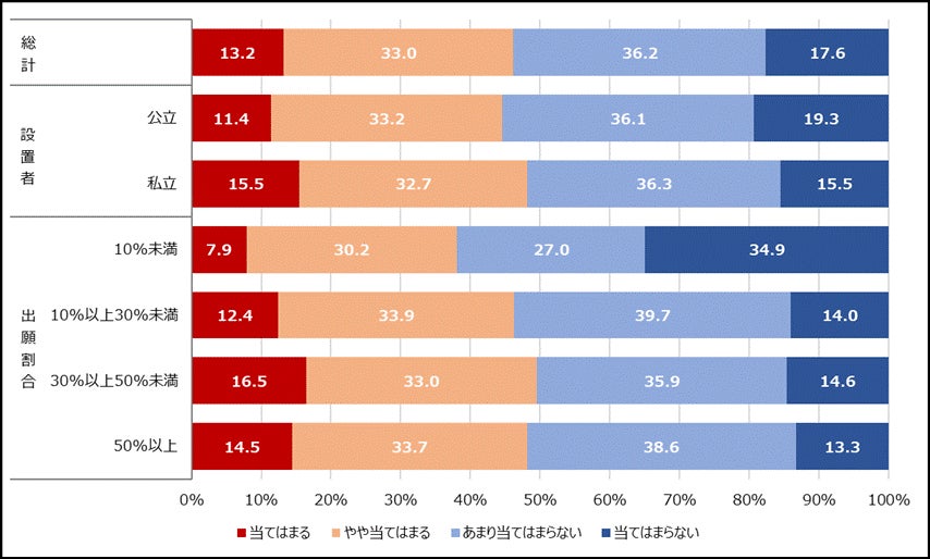 設置者別では公立高校において否定的な傾向が顕著に表れた。私立では「当てはまる」「やや当てはまる」の割合が4割を超え、肯定的にとらえている層が一定数いることがわかった。