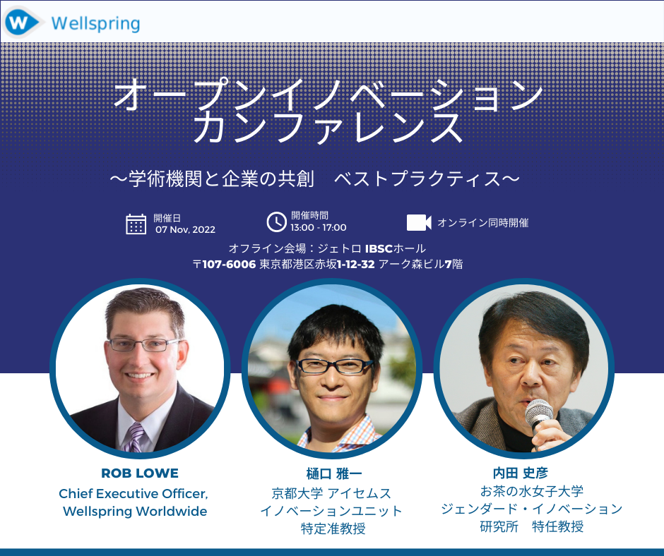 ウェルスプリングジャパン合同会社 (日本法人本社:東京都港区、日本法人代表:辻 雅史、以下ウェルスプリング)は、来る2022年11月7日に『オープンイノベーション カンファレンス 〜学術機関と企業の共創 ベストプラクティス〜』と題し、学術機関や企業の方々を対象としたセミナーをオンライン・オフラインで同時開催いたします。