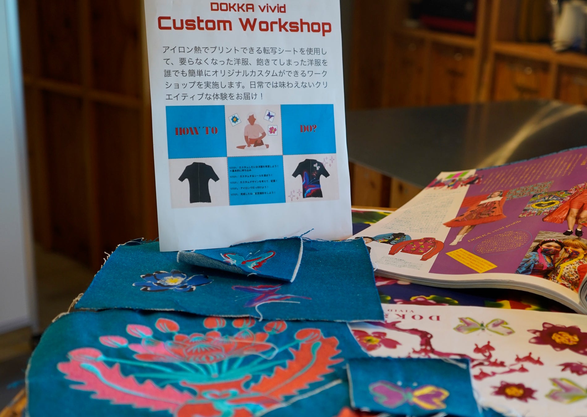 講師に「DOKKA vivid」の菅内のど佳氏 / 夏 明豊氏をお招きし、自宅にあるちょっと古くなってしまった服を、DOKKA vividのアイロンプリントを使って新しく蘇らせることができます。古着やバック等の持込OKですし、もちろん巾着やトートバッグを購入しての参加も可能です。