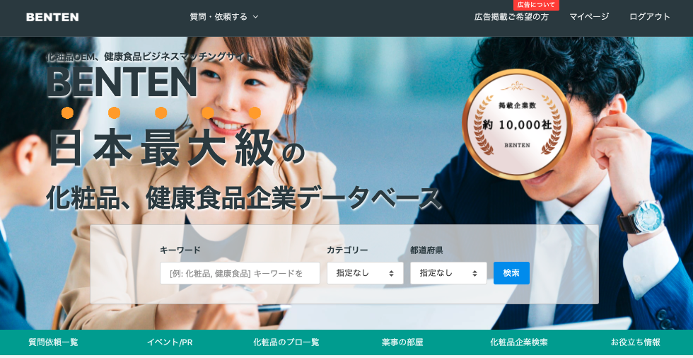 ・化粧品OEM、健康食品ビジネスマッチングサイトBentenはこちら