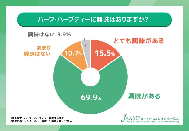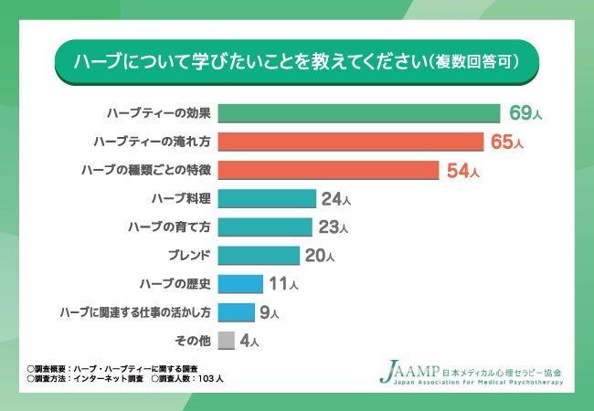 そこで今回、メディカルハーブカウンセラー®資格認定試験(https://www.domap.net/iyashi/herb/)を主催する日本メディカル心理セラピー協会(https://www.domap.net/)は、全国20〜60代の男女103名を対象に「ハーブ・ハーブティー」に関する調査を実施しました。