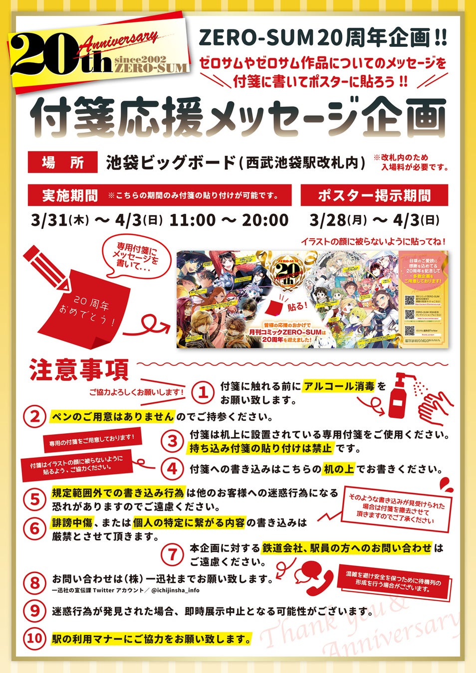 株式会社一迅社(所在地:東京都新宿区 代表取締役会長 野内雅宏)は、『月刊comicZERO-SUM』の創刊20周年を記念して、読者と作品ファンへの還元企画として3/31(木)より西武鉄道池袋駅改札内にて「応援メッセージ広告」の開催を致します。