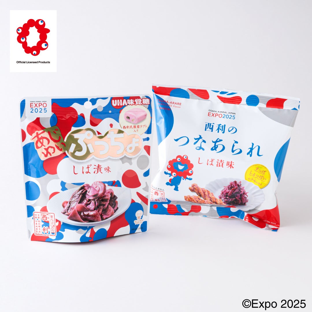 株式会社西利<2025大阪・関西万博>公式ライセンス商品、「EXPO2025【西利×UHA味覚糖】あじわいぷっちょ しば漬味 52g」と「EXPO2025ミャクミャク 西利のつなあられ しば漬味」