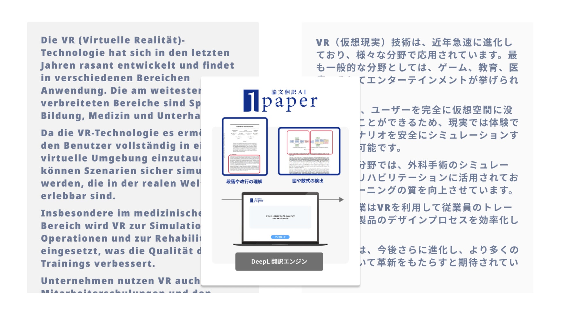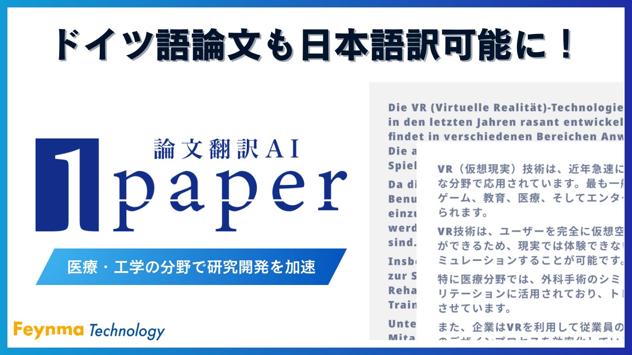 株式会社Feynma Technology(ファイマテクノロジー|愛知県名古屋市、代表 土屋太助)が提供するAI論文翻訳サービス「1paper」が、英語に加え、ドイツ語への対応も開始いたしました。専門用語も正確に翻訳し、研究者の皆様の作業効率を大幅にアップさせます。ただいま無料トライアルを実施中ですので、この機会にぜひお試しください。