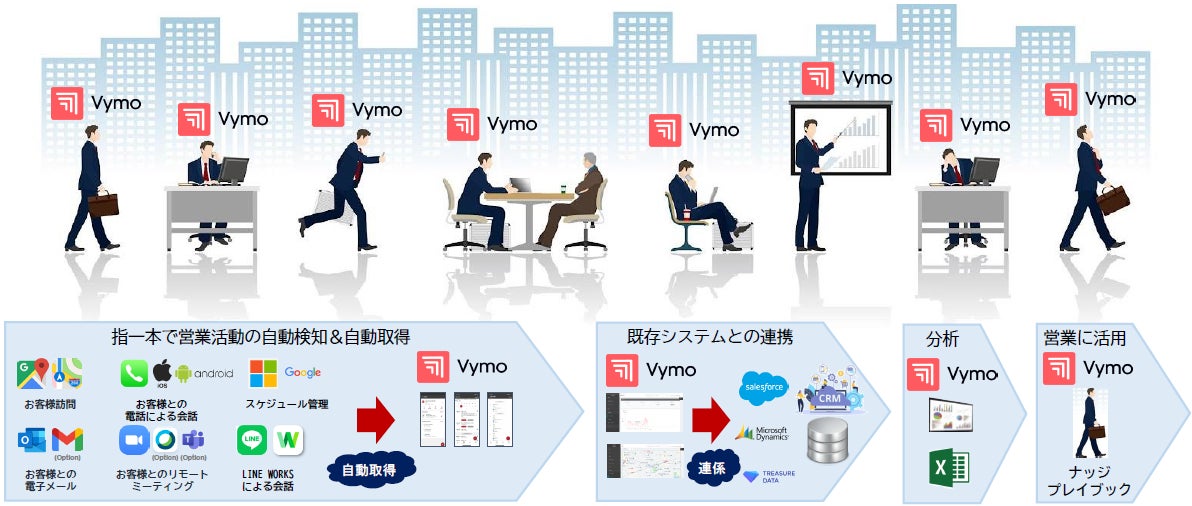 Vymoは65以上のグローバル企業および25万人以上のユーザーにて利用されているモバイル・リモート環境の為の営業活動支援ソリューションです。Vymoアプリは、顧客との電話、訪問、電子メール、リモートミーティング、LINE WORKSなどの活動を自動検知し、最小限の入力負荷で活動をCRM/SFAへ連携します。