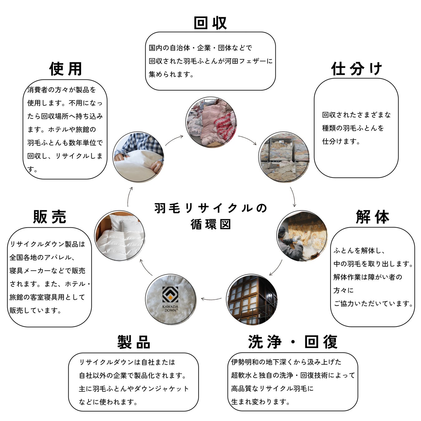 この仕組みは、不用になった羽毛ふとんを回収、独自の回復加工技術で高品質なリサイクル羽毛を精製、新たな羽毛製品として販売することで、「羽毛循環型社会」を実現するための取り組みです。