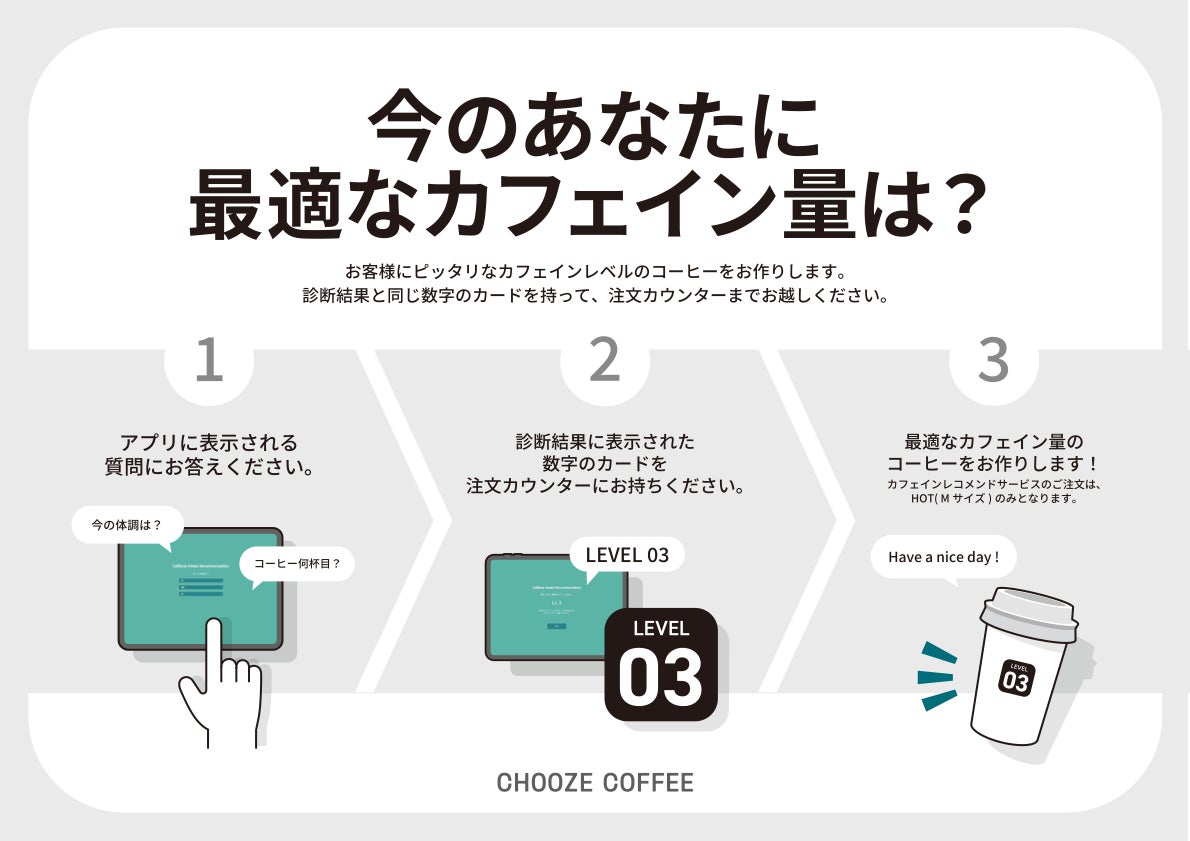 2025年2月17日(月)から、「CHOOZE COFFEE(チューズコーヒー)」日本橋店で、その日の健康状態や予定を把握し、最適なカフェイン摂取量を提案する「カフェインレコメンドサービス」を開始いたします。