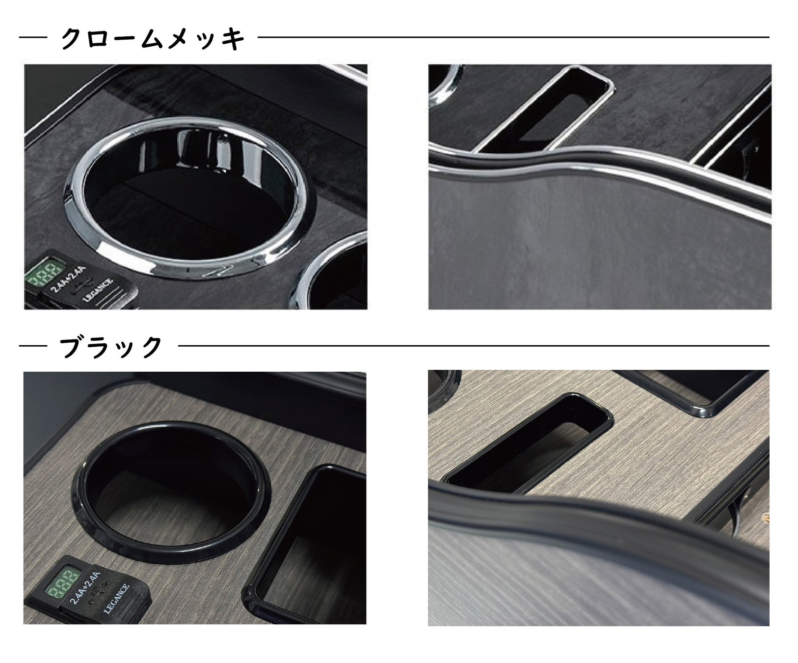 2024年12月23日よりDOGコンソールをはじめとする車の中に取り付ける『インテリアパーツ』の「モール」の色やドリンクを置くホルダー部分の色をブラックもしくはクロームメッキより選べるようになります。