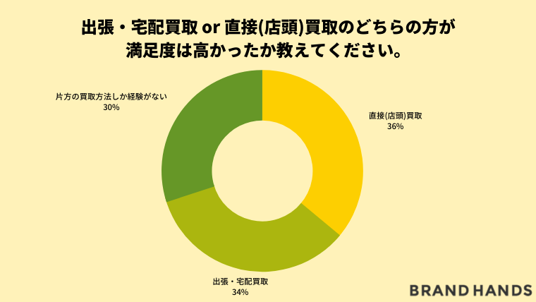 買取方法別の満足度は、1位:直接(店頭)買取(36票)、2位:出張・宅配買取(34票)、3位:片方の買取方法しか経験がない(30票)となりました。