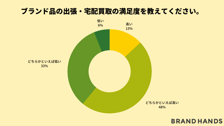 ブランド品の出張・宅配買取の満足度、高い・どちらかといえば高いを合わせて61票、低い・どちらかといえば低いを合わせて39票となりました。