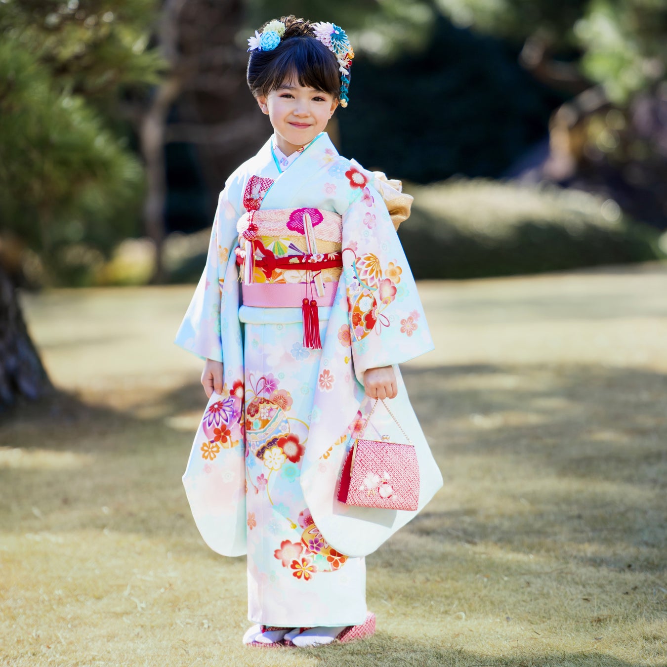 地紋に菊、梅、もみじの文様をあしらい、鈴柄がさらに可愛らしさを引き立てます。また、ぼかしの淡い紫やグリーンが全体に奥行きをプラス。赤の匹田柄の小物を合わせることで、古典的な上品さが加わります。