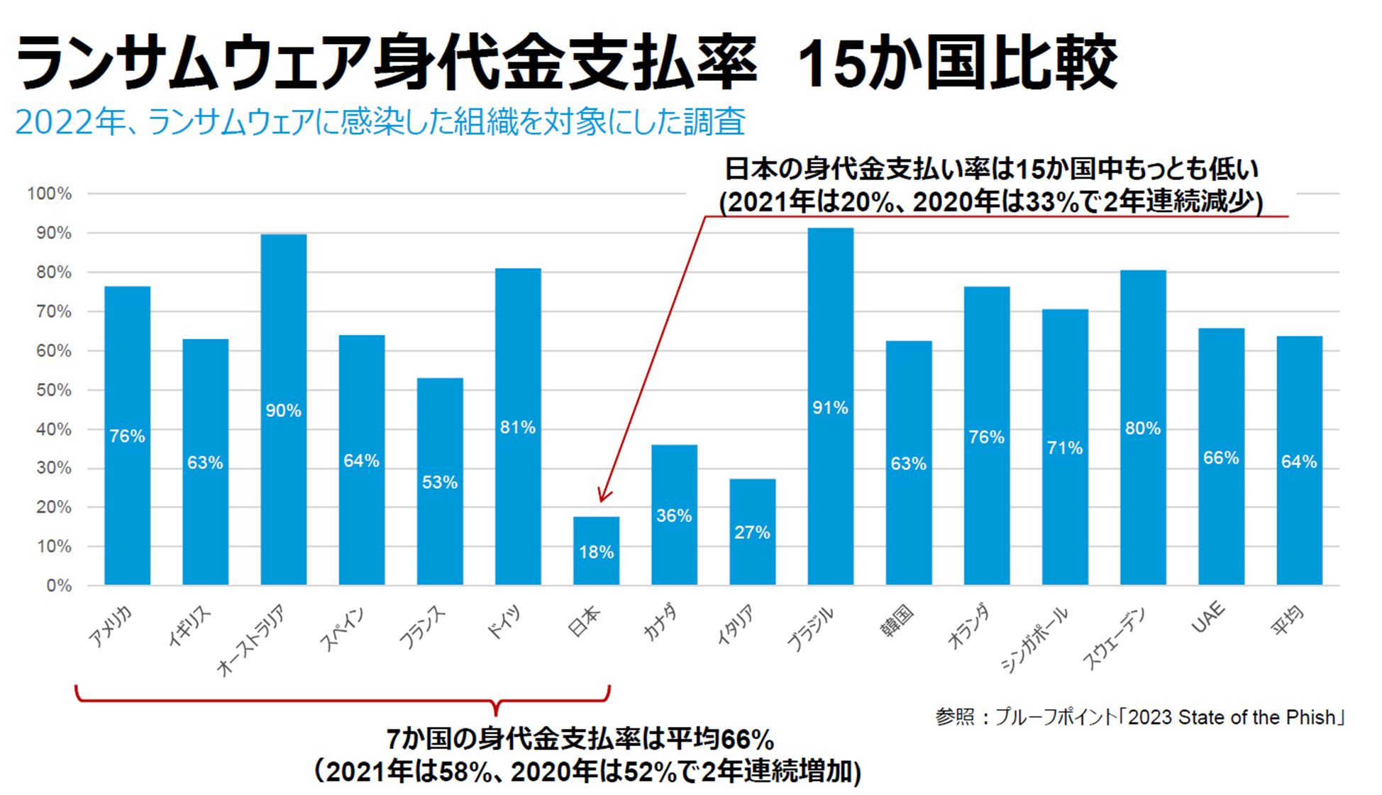 ランサムウェアに感染した日本の組織のうち、少なくとも1回の身代金を支払った日本の組織はわずか18%(昨年より2ポイント減)で、世界平均の64%と比べ大きく下回っており世界のトレンドと逆行している。プルーフポイントの3年にわたる調査のうち、日本は3年連続で調査対象国のうち、最も低い身代金の支払率となっている。