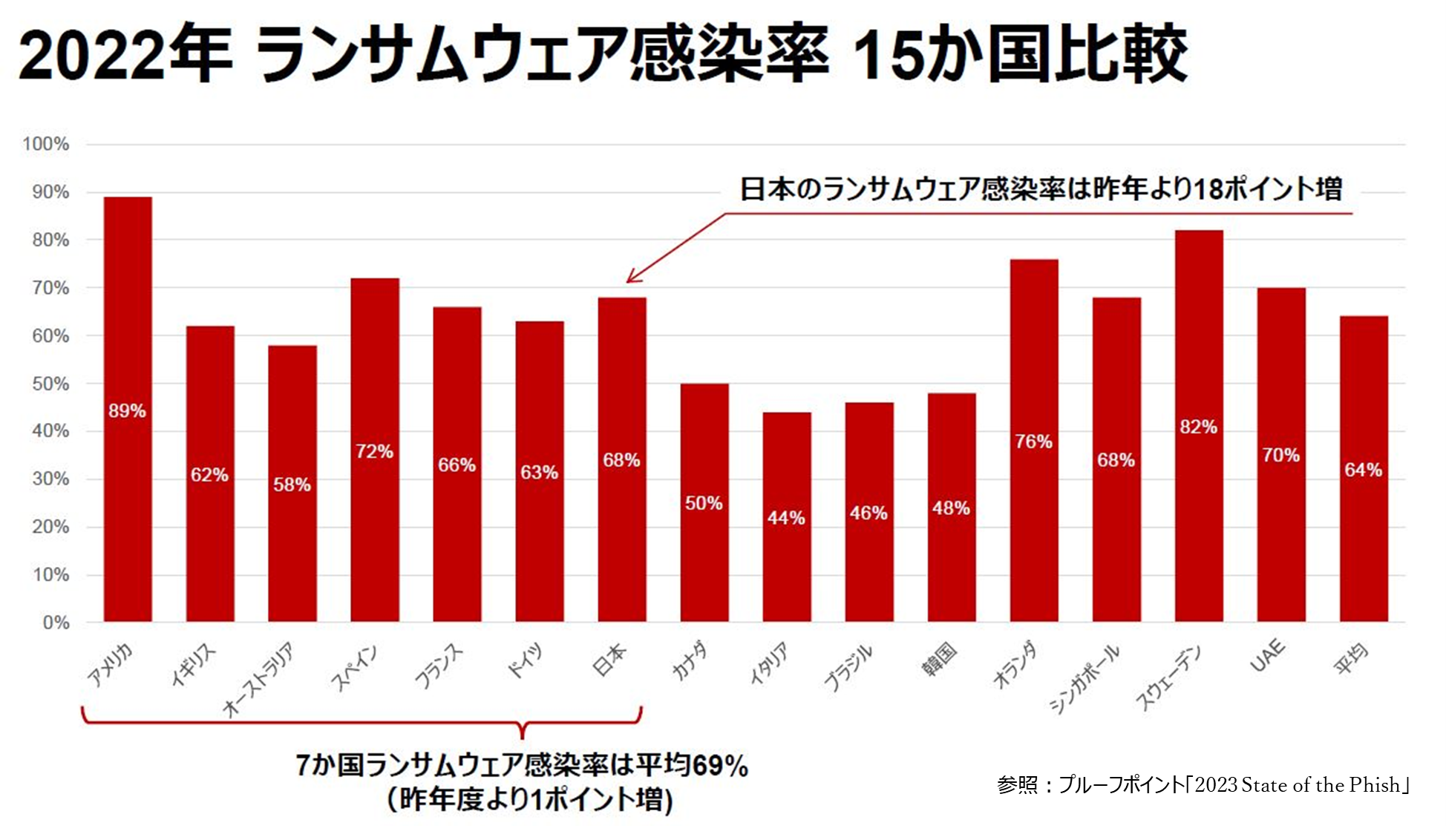 調査対象である日本の組織のうち68%(世界平均:64%)がランサムウェア実際に感染(2021年は50%、18ポイント増)。