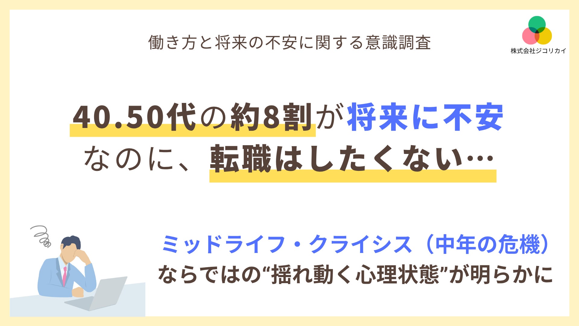 今回の調査から、「将来に不安がある」「やりたいことを仕事にできていない」にも関わらず、現状を変えようとはしない、転職も考えていないという中年層特有の行き詰まり感が見て取れます。