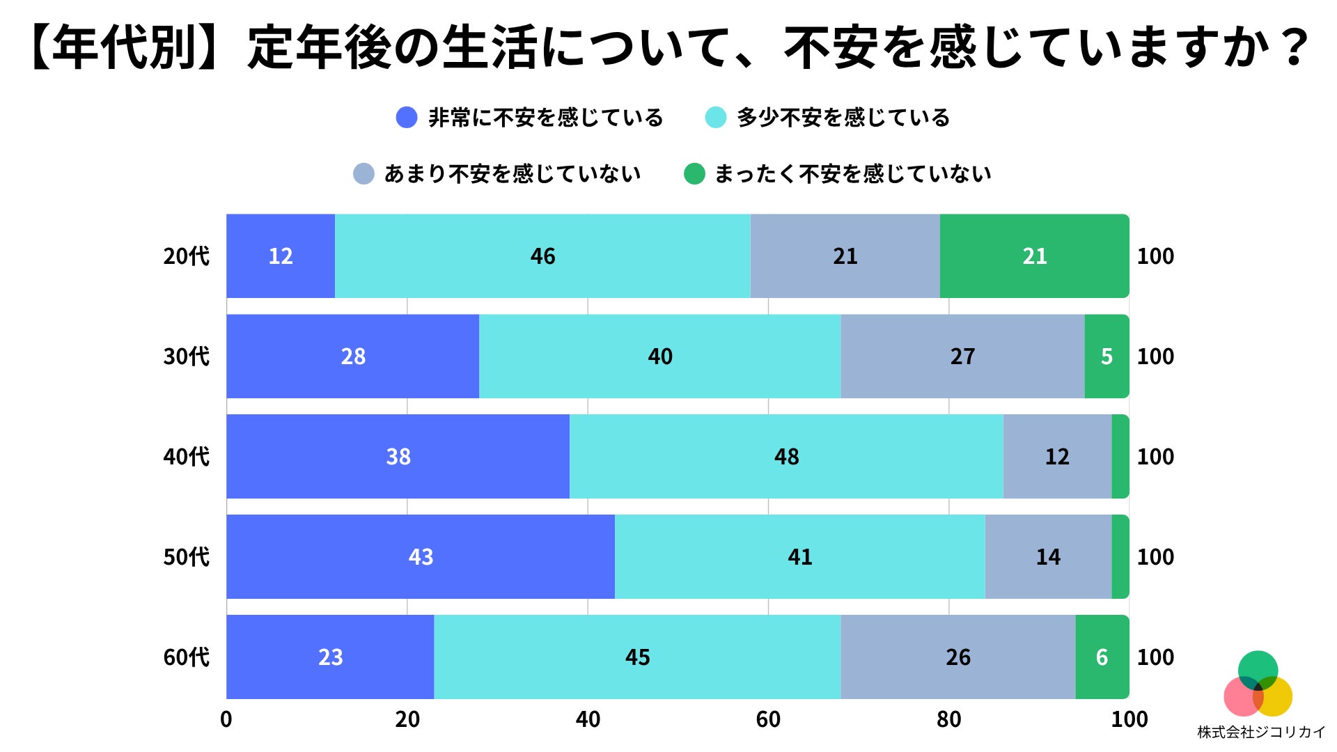 将来の仕事に対する不安と同様に、キャリアの中盤を迎えた40〜50代が、定年後の生活にも強い不安を抱いていることが浮き彫りとなりました。