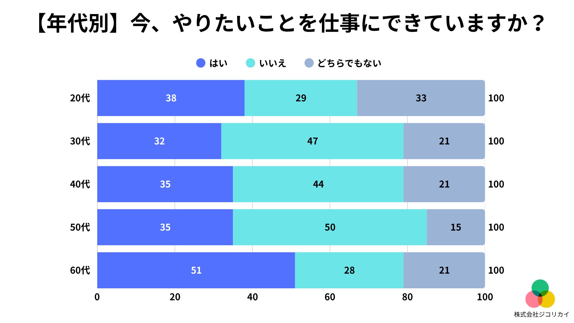 「やりたいことを仕事にできているか」という問いに対し、「いいえ」と回答した割合が最も高かったのは50代で半数にのぼりました。