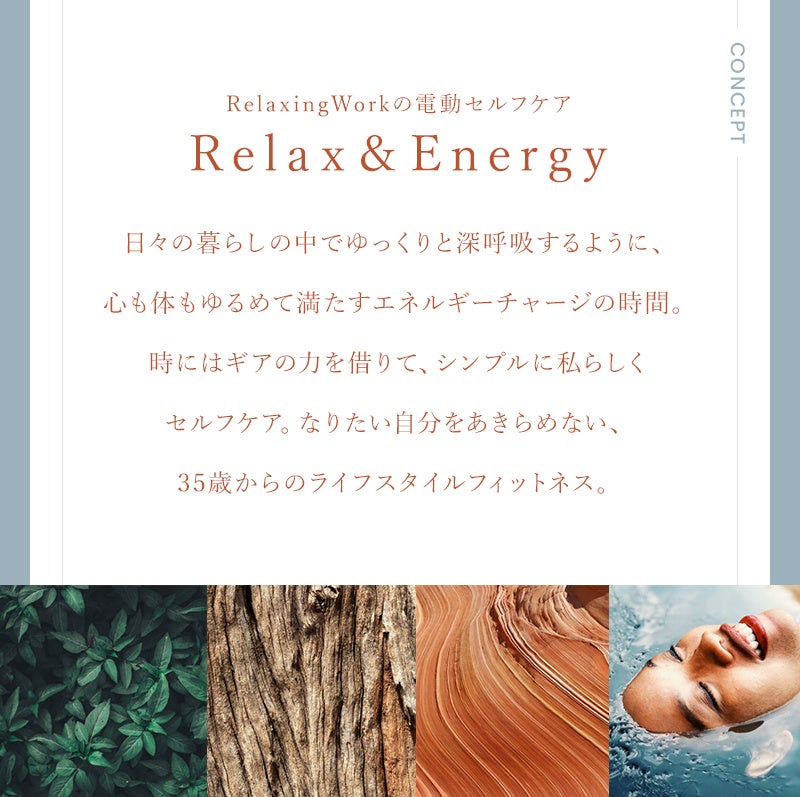 Relaxing Work(リラクシングワーク)は、からだもこころもゆらぎを感じる35歳前後女性のためのセルフケアブランドです。健康や美容に関心はあるものの、仕事や子育て、家事などの役割に追われ自分の時間が取りづらい女性や、年齢を重ねるにつれ心身に変化を感じやすい「ゆらぎ世代」の女性たちに寄り添った商品を展開しています。心地よさを追求したシンプル設計のプロダクトと大切な人へのギフトにぴったりなパッケージデザインを特徴としています。使い方がわかるムービー付きではじめてでもかんたんな設計です。現代女性の忙しいライフスタイルに寄り添いながら、セルフケアを提案しています。開発チームは等身大の女性社員で、使用感やお洒落なデザインにこだわっています。全国の雑貨店やECサイトを中心として商品を展開中。ご好評をいただき、シリーズ累計販売数80万個を突破いたしました。