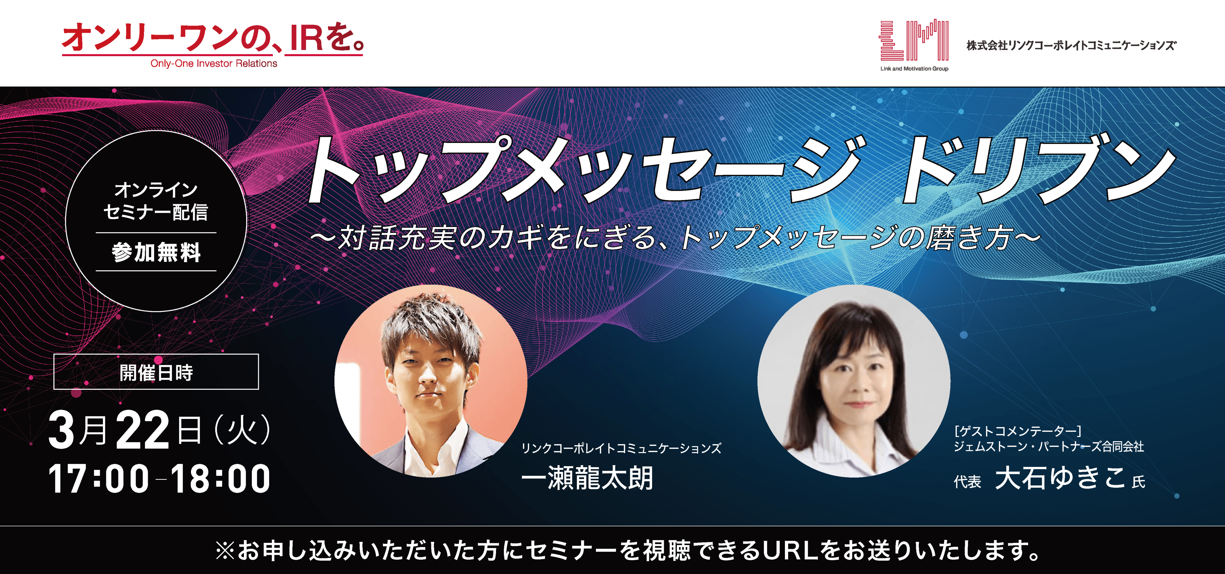 株式会社リンクアンドモチベーション(本社:東京都中央区、代表:小笹芳央、証券コード:2170)のグループ会社で、企業のIR領域を支援する株式会社リンクコーポレイトコミュニケーションズ(本社:東京都中央区 代表:白藤大仁)は、『トップメッセージ』をテーマに無料WEBセミナーを開催します。