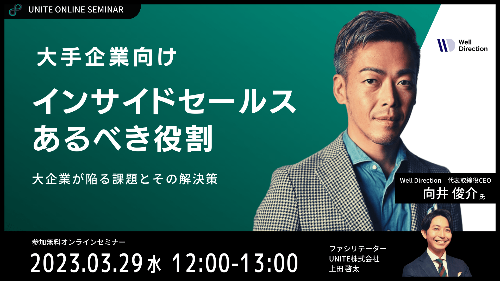 インサイドセールス組織の立ち上げ支援を行うUNITE株式会社(東京都港区、代表取締役:上田啓太、以下「ユナイト」)、B2B営業の体質改善から 長期的に強い組織・ビジネスを作るための本質的なアドバイスを行うWell Direction(代表取締役:向井 俊介、以下「ウェルディレクション」)は、大手企業のインサイドセールス組織に関わる方に向けて、そのあるべき役割をご紹介するオンラインセミナーを、2023年3月29日(水)に共催することをお知らせいたします。