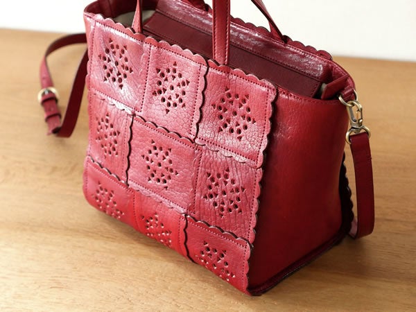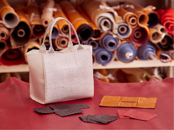 まずは何パターンものデザインから選び抜いた柄の型紙でサンプルをつくり、柄が決まったら製品と同じ素材の革を使って、全体のバランスを見ながら何度も微調整を繰り返していきます。そして実際の重なり具合を確認し、ようやく一つのバッグに実を結んでいます。