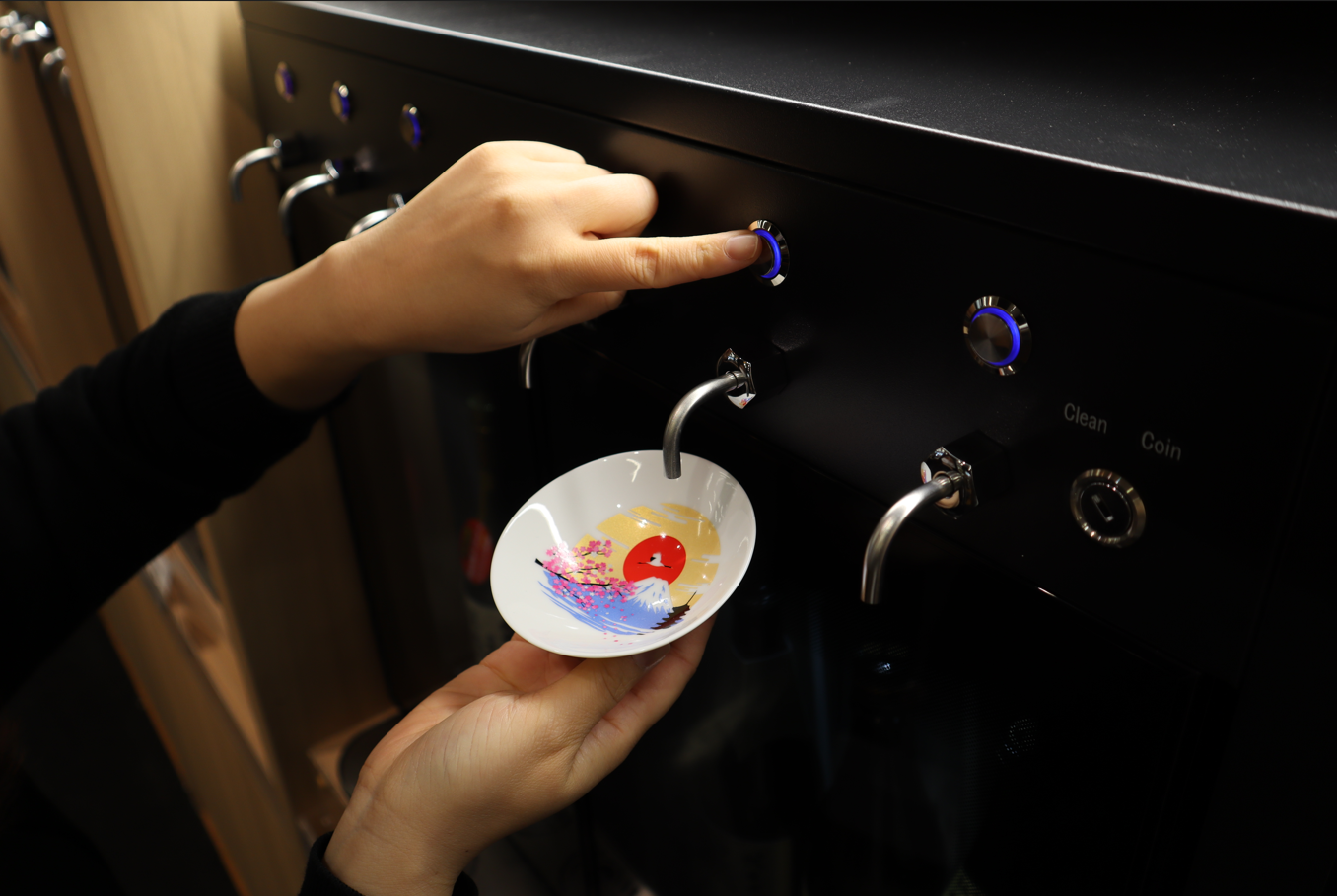 箱根を訪れる国内外のお客様に特別な体験を!という思いから、利き酒コーナーを設置いたしました。日本酒は厳選した30銘柄をご用意。まずはコインと試飲用カップをご購入いただき、気になる日本酒をご自身で選んで試飲できます。気に入った日本酒はその場で購入することも可能です。